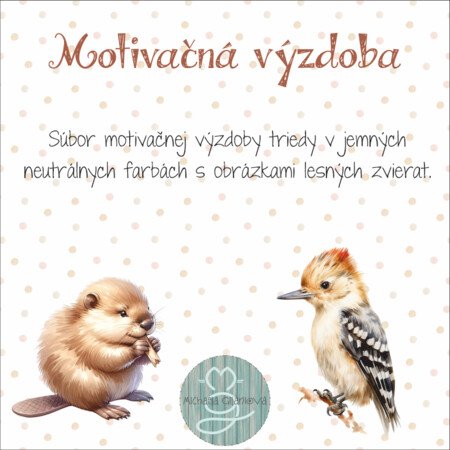 Balík obsahuje rôzne motivačné kartičky a vizuálne pomôcky, ktoré zdobia triedu a zároveň poskytujú didaktické nástroje na podporu emocionálneho a sociálneho rozvoja žiakov. Jemné neutrálne farby a ilustrácie lesných zvierat pridávajú estetickú hodnotu a vytvárajú upokojujúcu atmosféru v triede.
