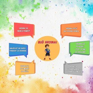 Materiál „Buď hrdina“ je určený na výzdobu triedy alebo nástenky a zároveň slúži ako praktická pomôcka na rozhovor a