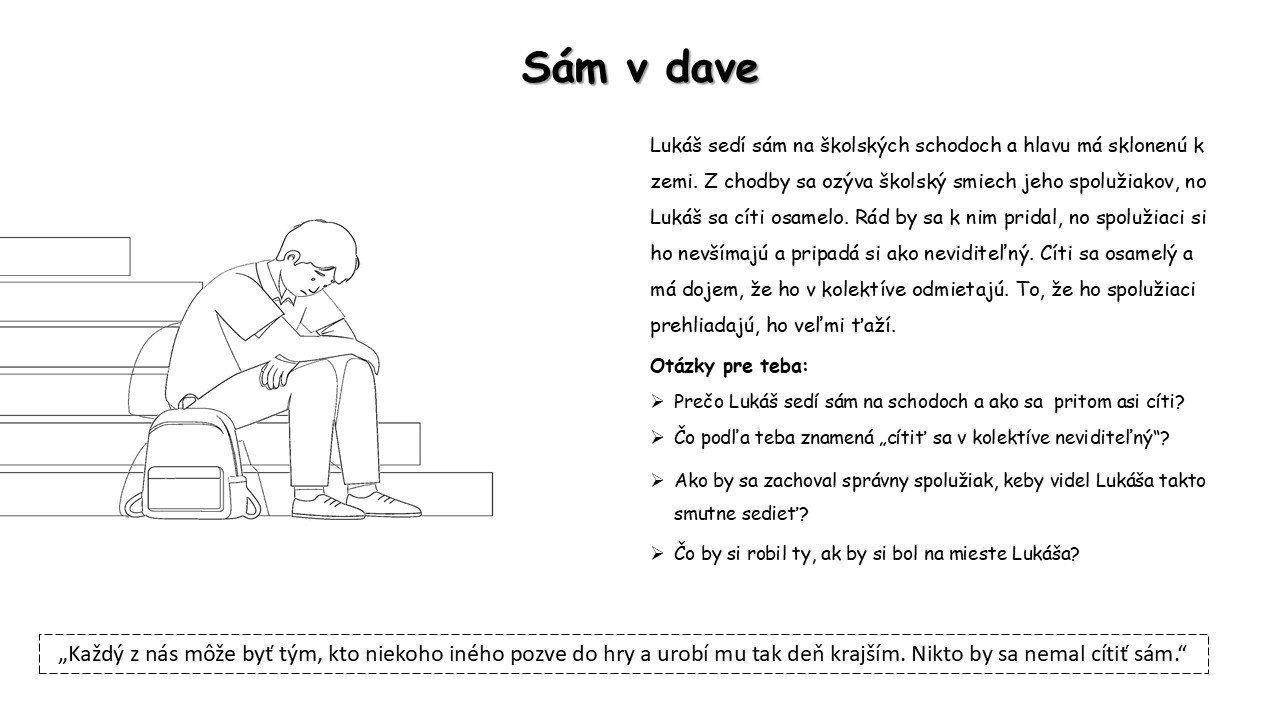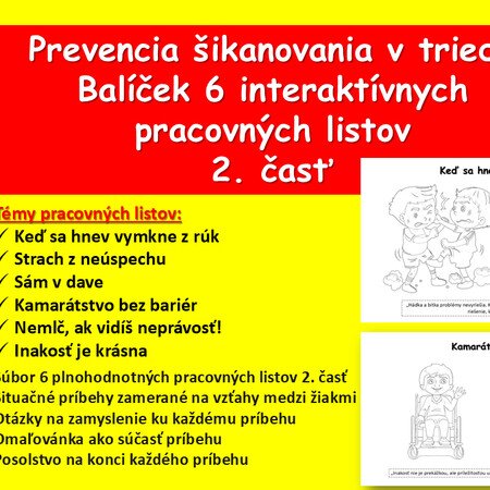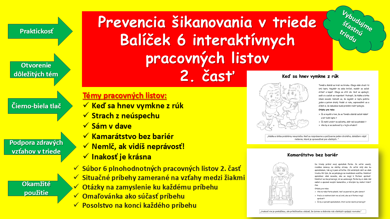 Rada by som Vám predstavila pokračovanie interaktívnych pracovných listov zameraných na bezpečné prostredie v triede. Súčasťou pracovných listov je obrázok so situáciami, ktoré slúžia ako omaľovánka, príbeh zo školského prostredia, otázky na zamyslenie a diskusiu k príbehu a posolstvo, teda hlavná myšlienka vyplývajúca z príbehu.