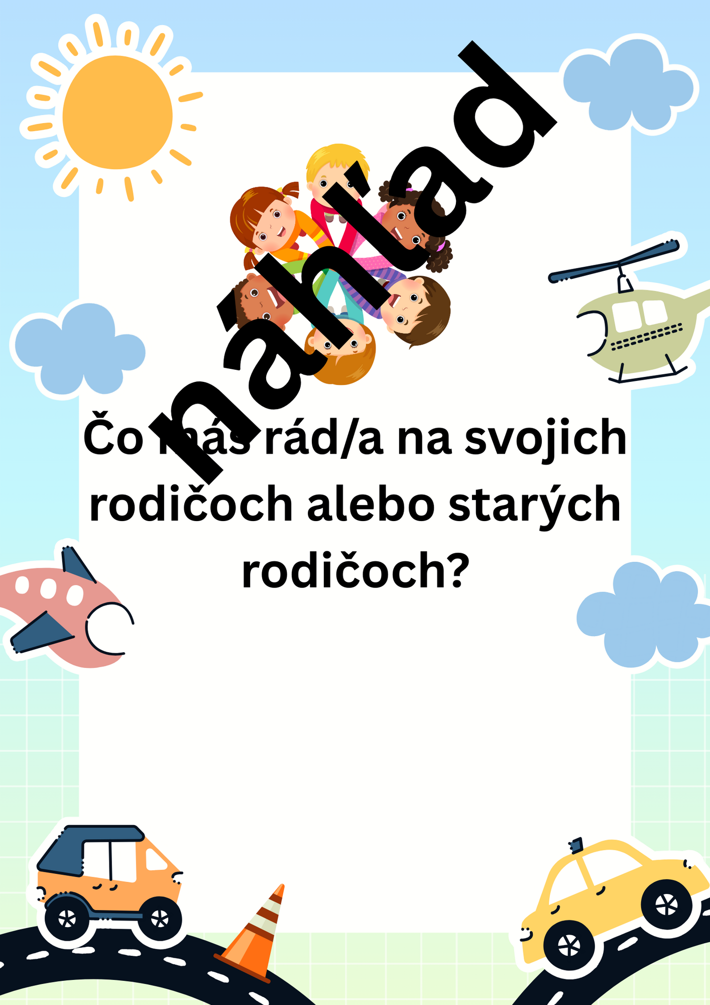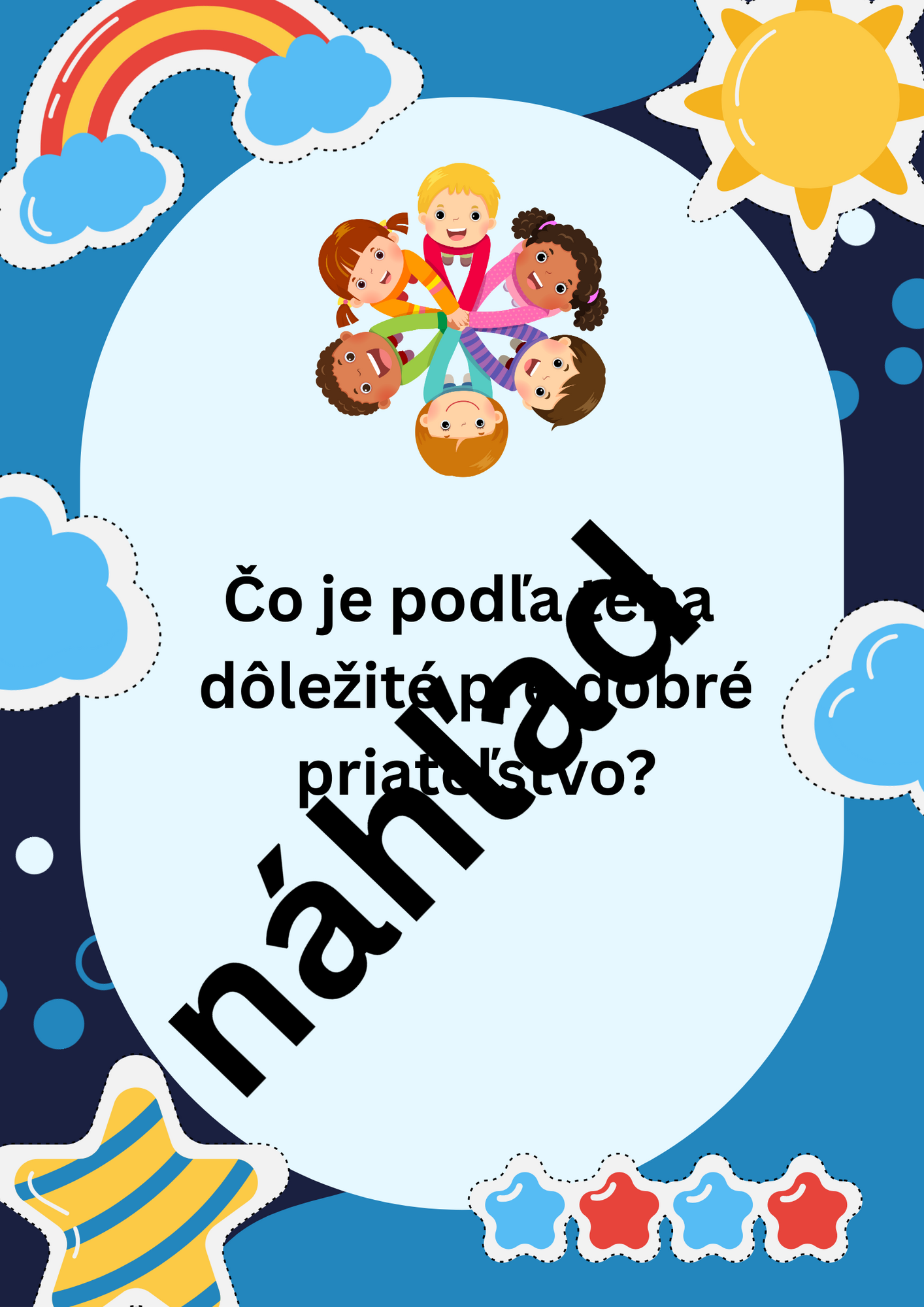 Kartičky s otázkami sú vhodné na ranný kruh, alebo na hodiny etickej výchovy. Deti si ťahajú kartičky a odpovedajú na otázky. Otázky sú zamerané na vzťahy medzi spolužiakmi a vzťahy v rodine. Cieľom je rozvíjať komunikáciu u detí. Je potrebné vytlačiť si 4 kartičky na A4 a zalaminovať.