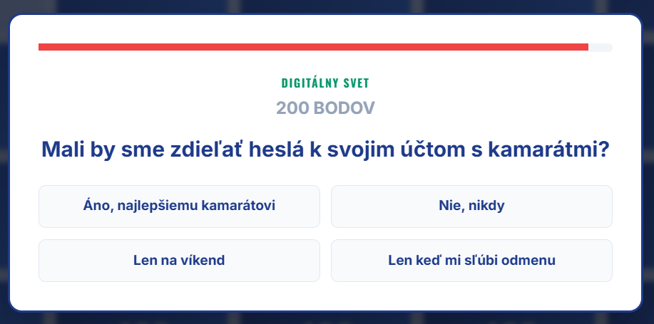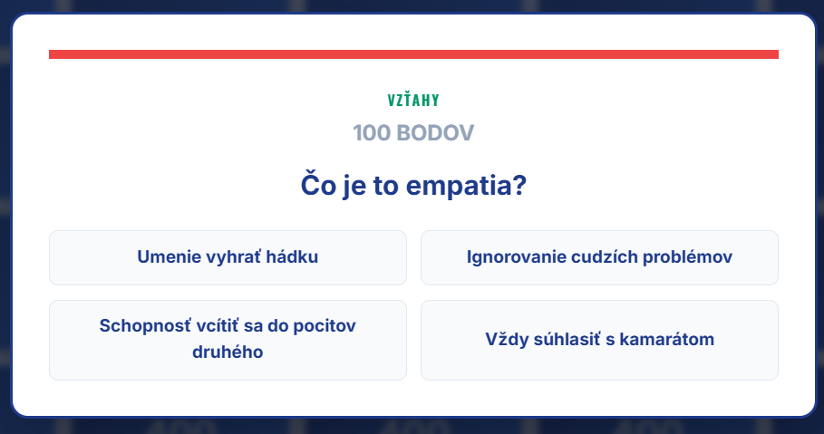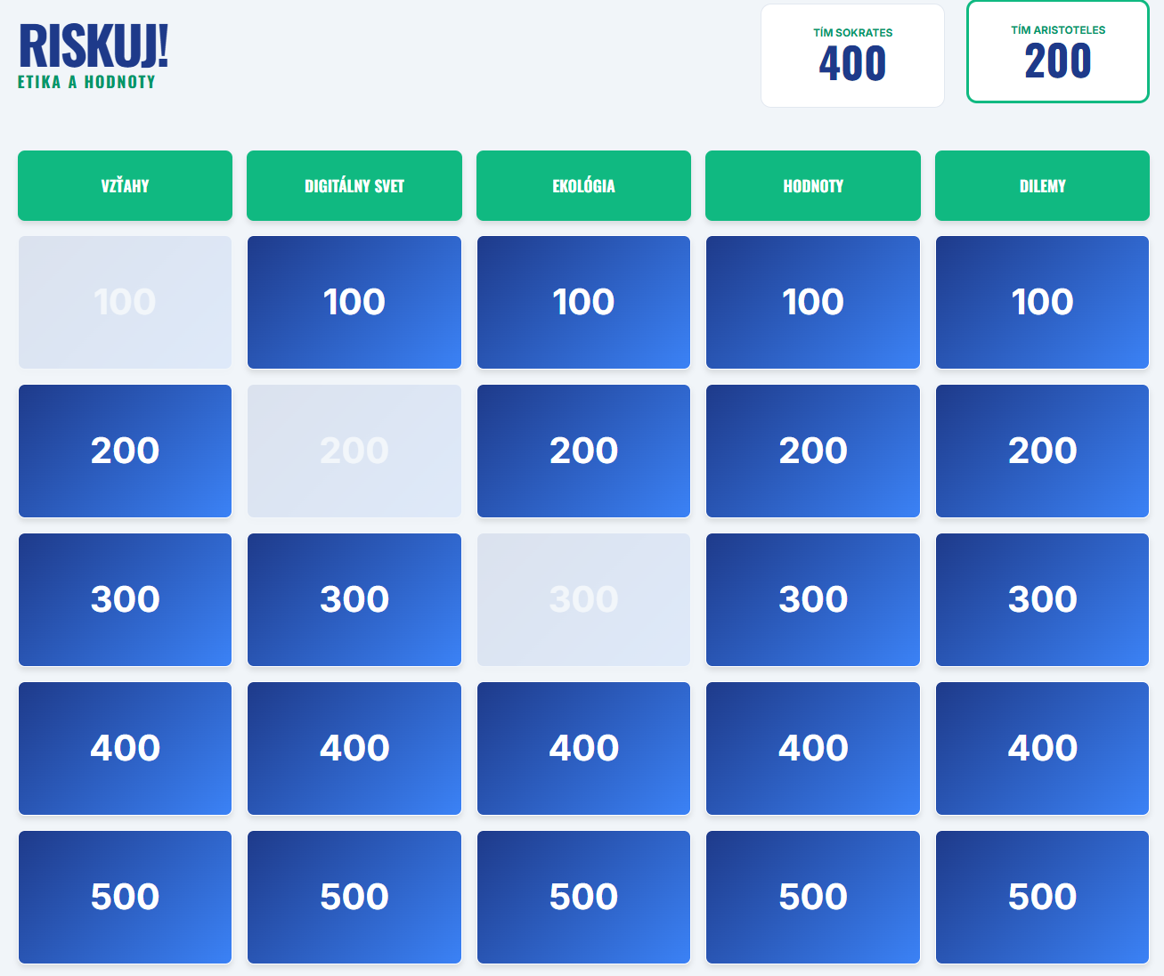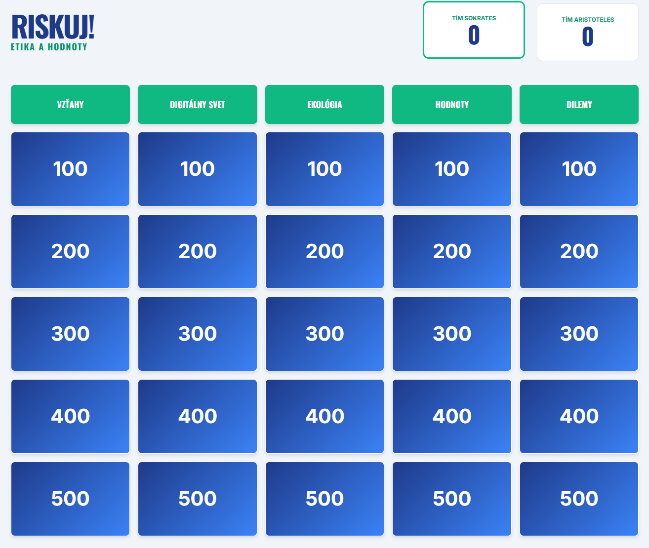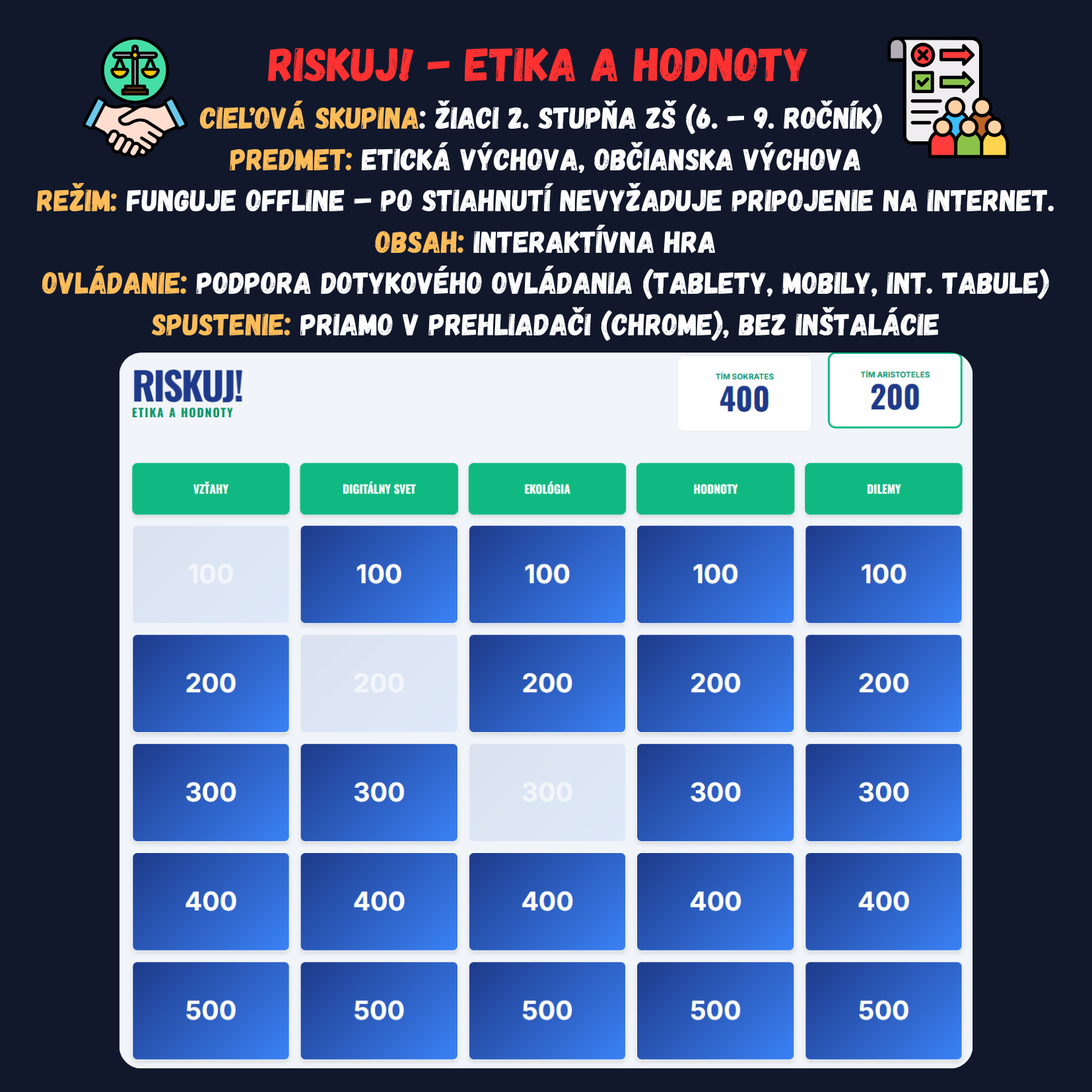Premeňte hodinu etiky alebo občianskej náuky na napínavý súboj medzi tímami Sokrates a Aristoteles! Táto digitálna hra prenáša obľúbený formát televíznej súťaže Riskuj priamo do vašej triedy. Žiaci sa hravou formou naučia základy slušného správania, bezpečnosti na internete, ekológie a riešenia morálnych dilem.