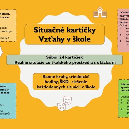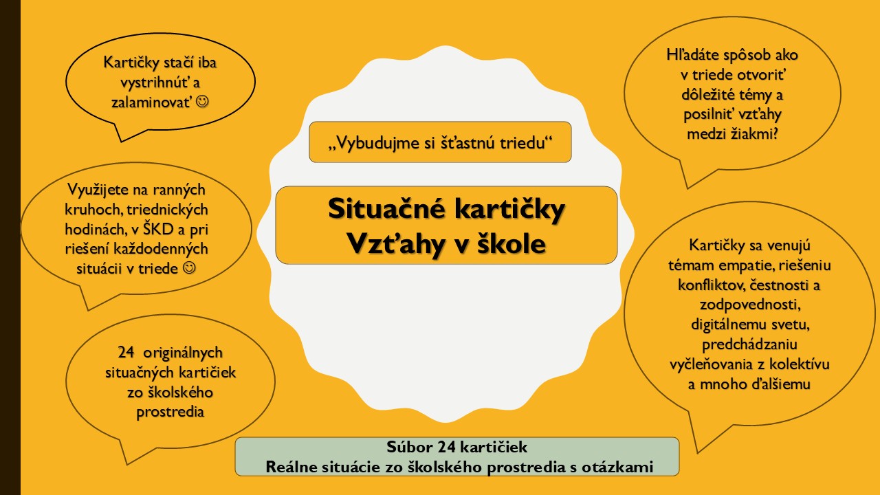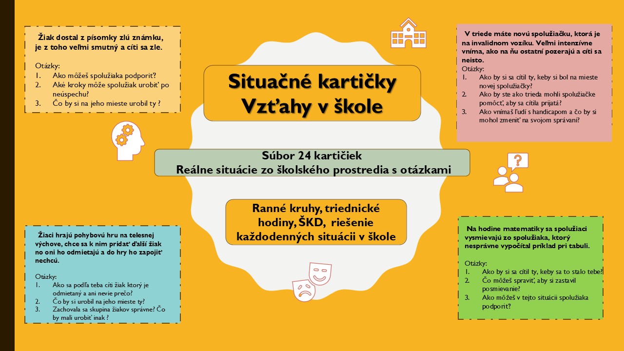 Tieto situačné kartičky pokrývajú širokú škálu tém od tém priateľstva, zodpovednosti, čestnosti až po náročnejšie témy ako prijatie odlišnosti, vylúčenie z kolektívu, povyšovanie sa