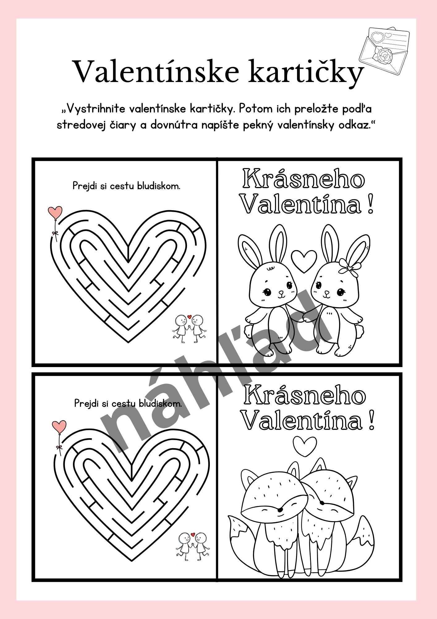 Balíček valentínskych aktivít pre a 1.– 3. ročník ZŠ. Materiál obsahuje krátky príbeh o stratenej valentínke, triednu valentínsku poštu (obálka na valentínky) a kartičky s bludiskom a obrázkami na vyfarbenie. Deti si kartičky vystrihnú, vyriešia bludisko a napíšu milý odkaz pre kamaráta.