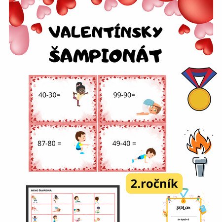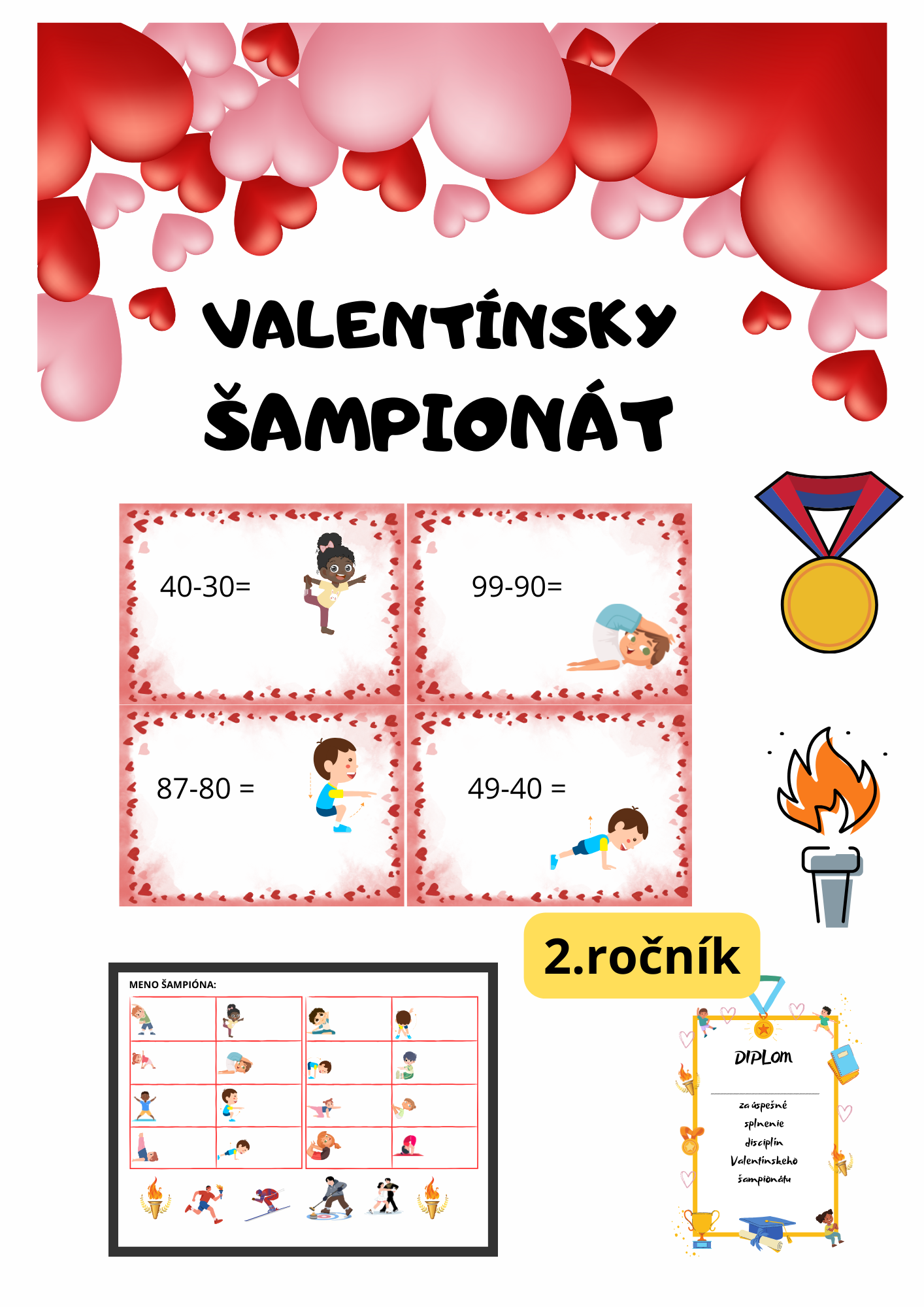 Valentínsky šampionát prepája najväčšie športové hry s valentínskou tematikou a pohybom. Žiak rieši príklady, výsledok si zapisuje do kartičky šampióna a podľa čísla vykoná daný počet opakovaní cviku na obrázku. Po splnení všetkých disciplín získava zaslúžený DIPLOM ŠAMPIÓNA.