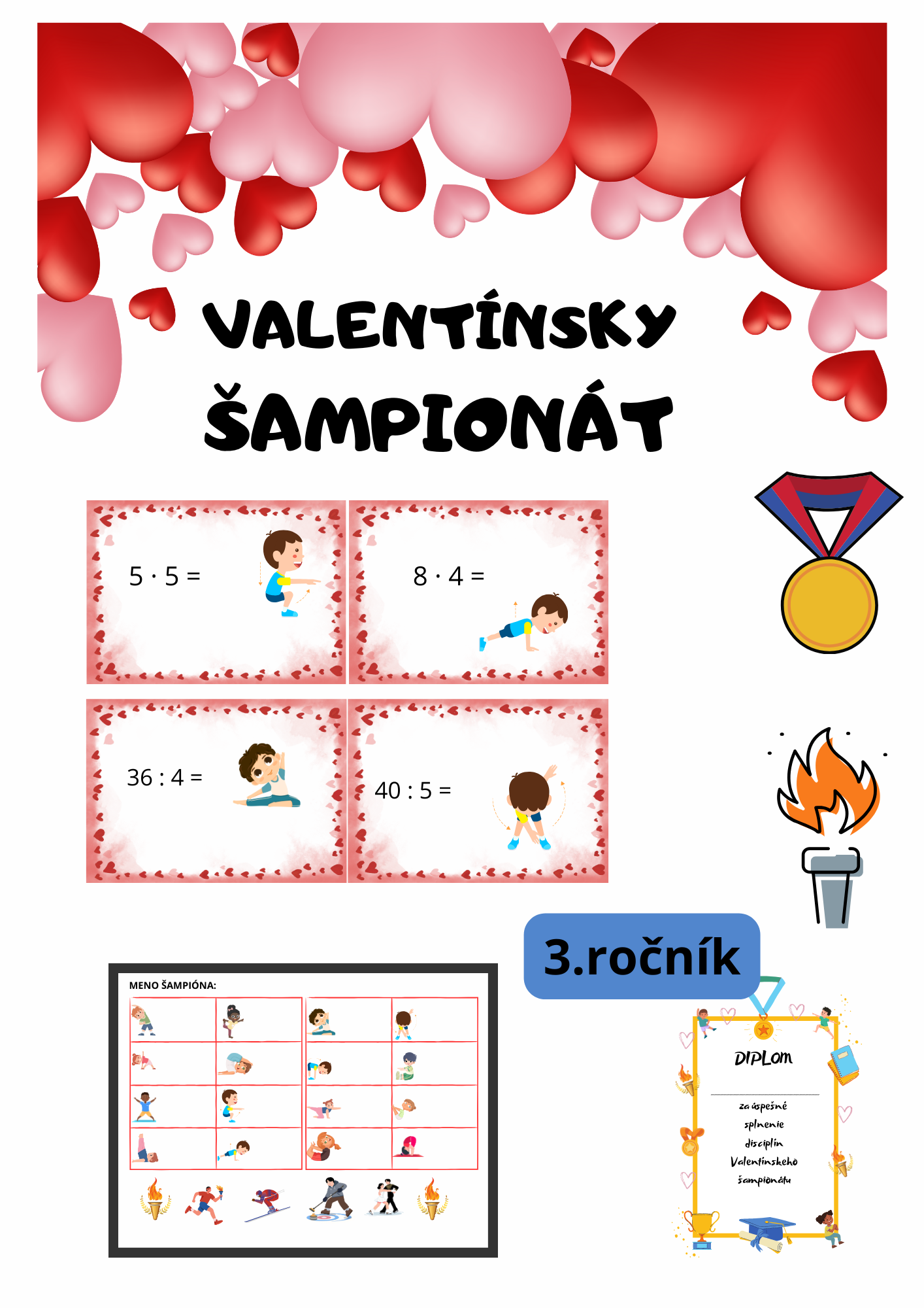 Valentínsky šampionát prepája najväčšie športové hry s valentínskou tematikou a pohybom. Žiak rieši príklady, výsledok si zapisuje do kartičky šampióna a podľa čísla vykoná daný počet opakovaní cviku na obrázku. Po splnení všetkých disciplín získava zaslúžený DIPLOM ŠAMPIÓNA.