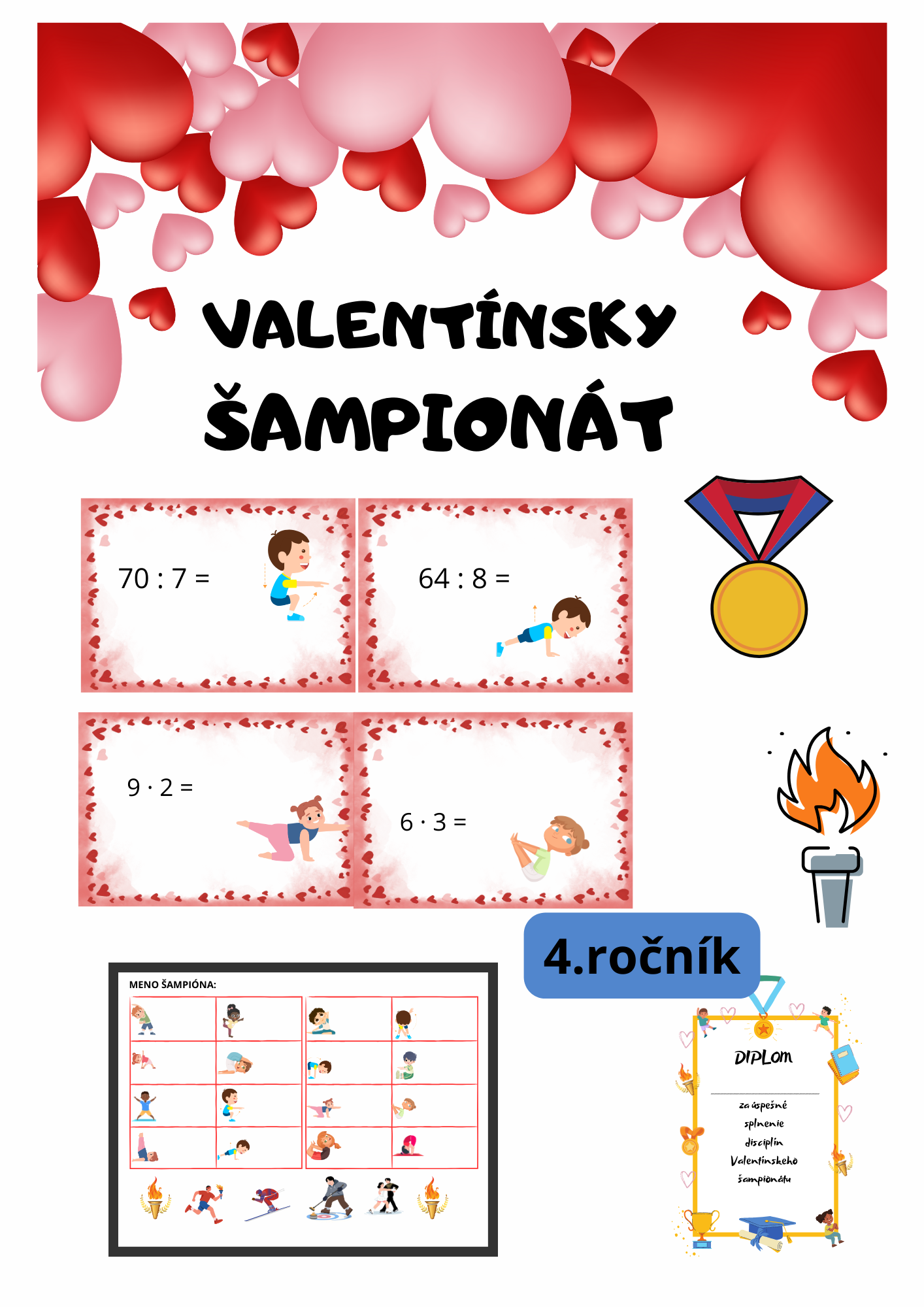 Valentínsky šampionát prepája najväčšie športové hry s valentínskou tematikou a pohybom. Žiak rieši príklady, výsledok si zapisuje do kartičky šampióna a podľa čísla vykoná daný počet opakovaní cviku na obrázku. Po splnení všetkých disciplín získava zaslúžený DIPLOM ŠAMPIÓNA.