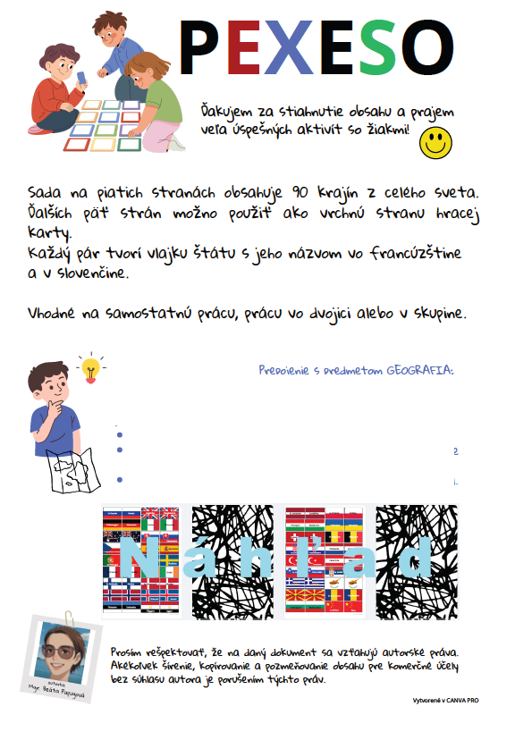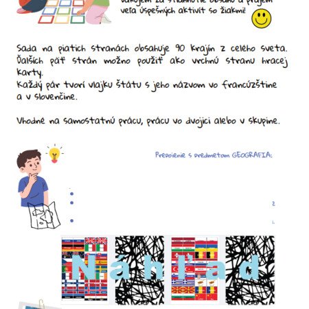 PEXESO krajiny-vlajky je učebný materiál určený pre žiakov francúzskeho jazyka, ktorí majú radi aj geografiu.