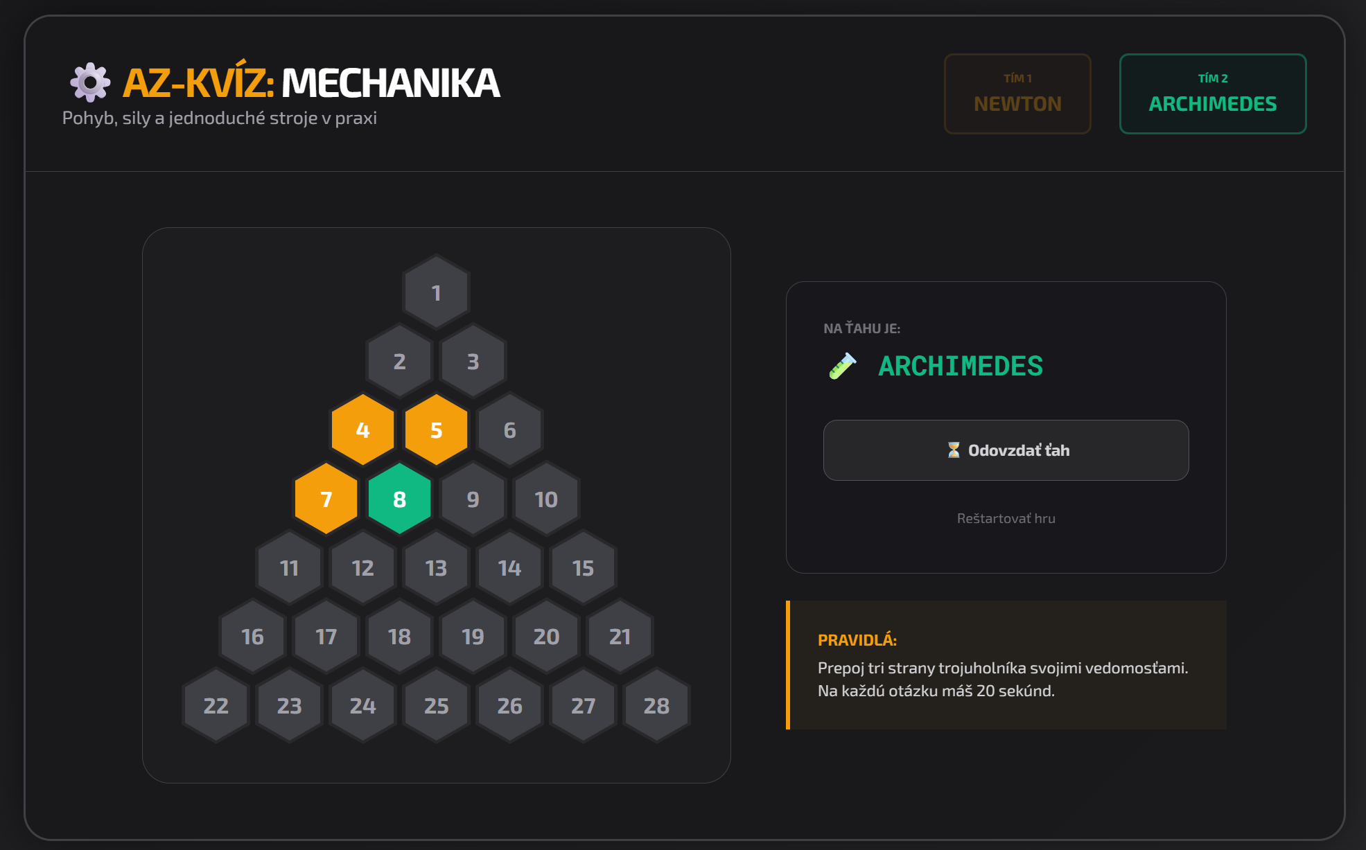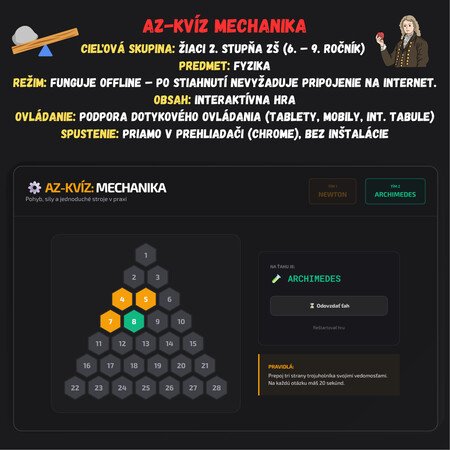 Premeňte hodinu fyziky na napínavý súboj medzi tímami Newton a Archimedes! Táto digitálna hra prenáša obľúbený formát AZ-kvízu priamo do vašej triedy. Žiaci sa hravou formou naučia všetko o pohybe, silách a jednoduchých strojoch.