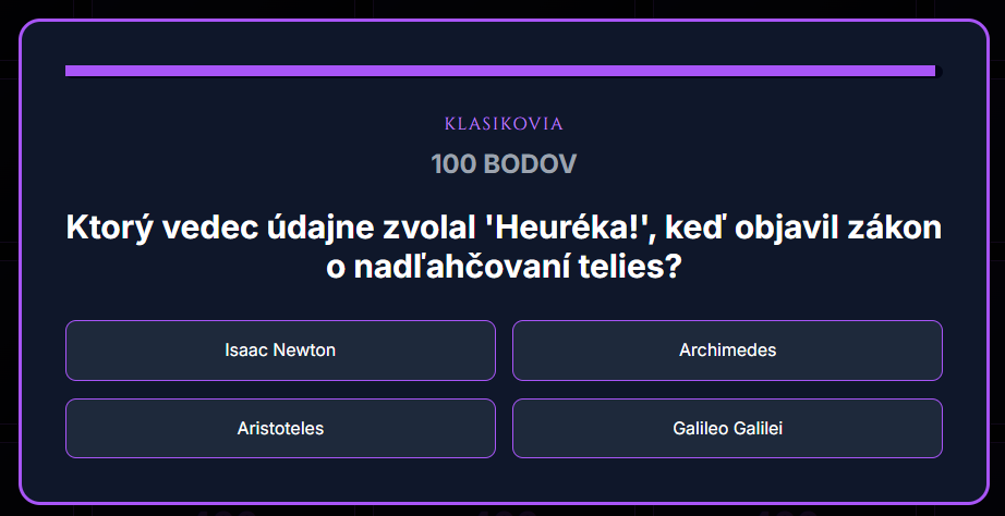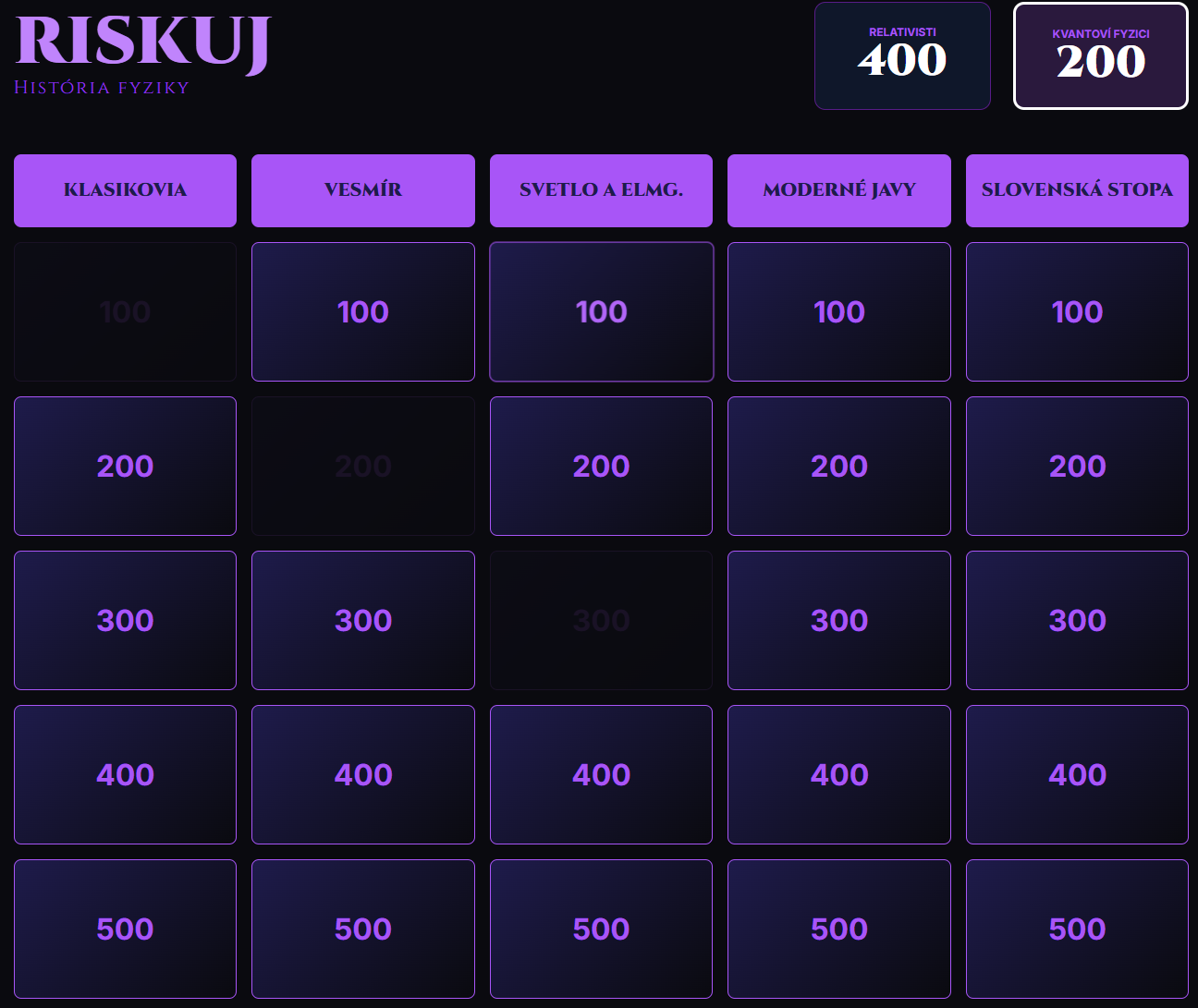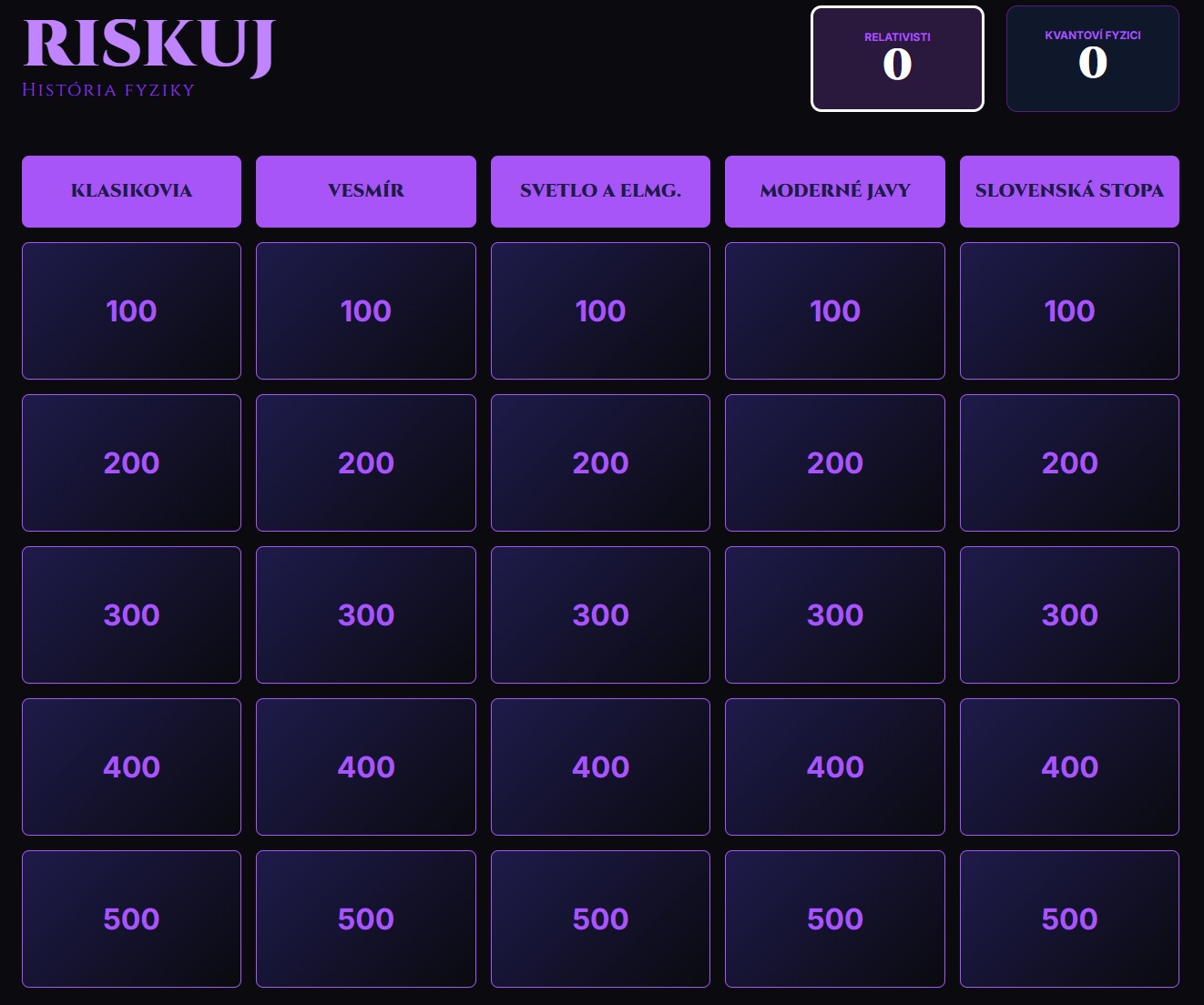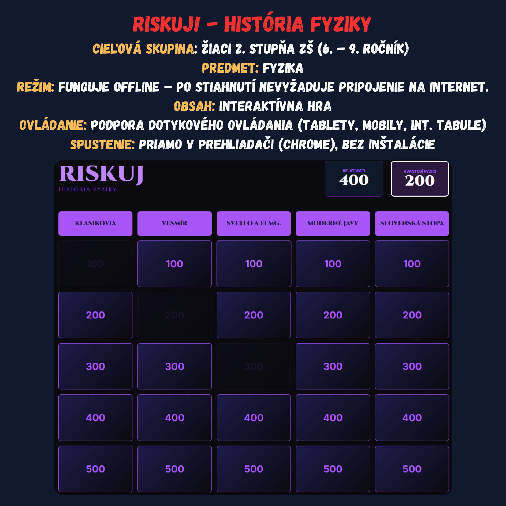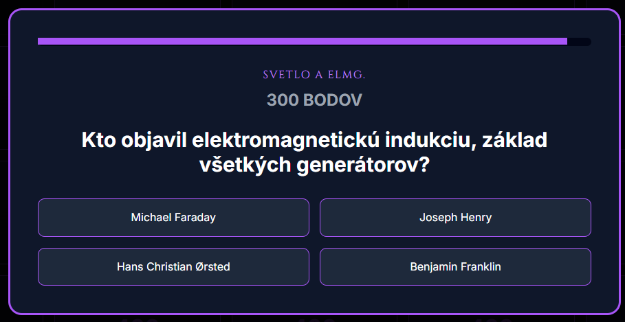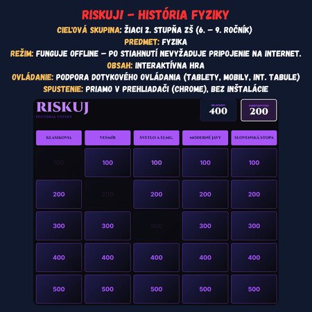 Premeňte hodinu fyziky na napínavý súboj vedomostí! Táto digitálna hra prenáša obľúbený formát televíznej súťaže Riskuj! priamo do vašej triedy. Žiaci sa hravou formou ponoria do osudov slávnych vedcov a kľúčových objavov, ktoré zmenili náš svet – od Archimédovho výkriku Heuréka až po Higgsov bozón.