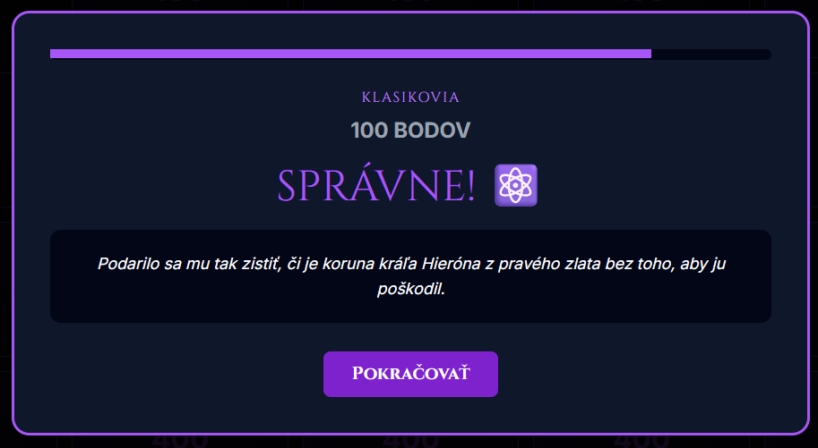 - Vizuálna spätná väzba: Po každej odpovedi sa zobrazí správne riešenie a zaujímavosť (Fun Fact), čo zaisťuje vzdelávací efekt aj pri chybnej voľbe.