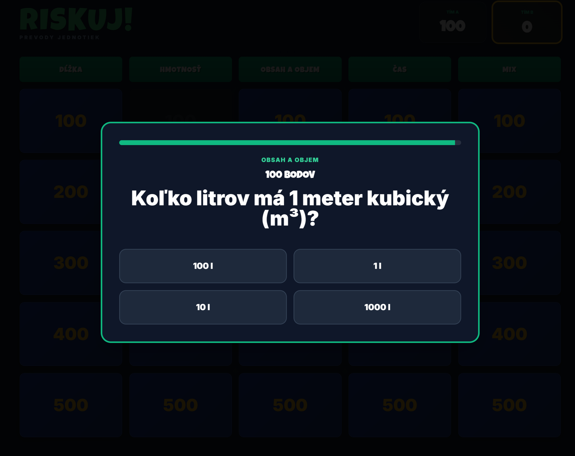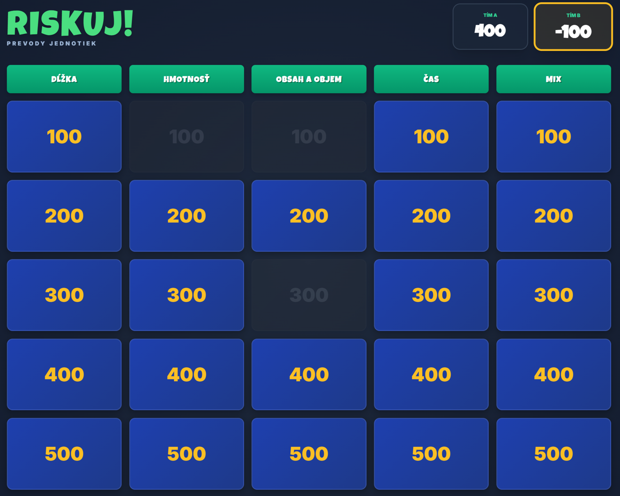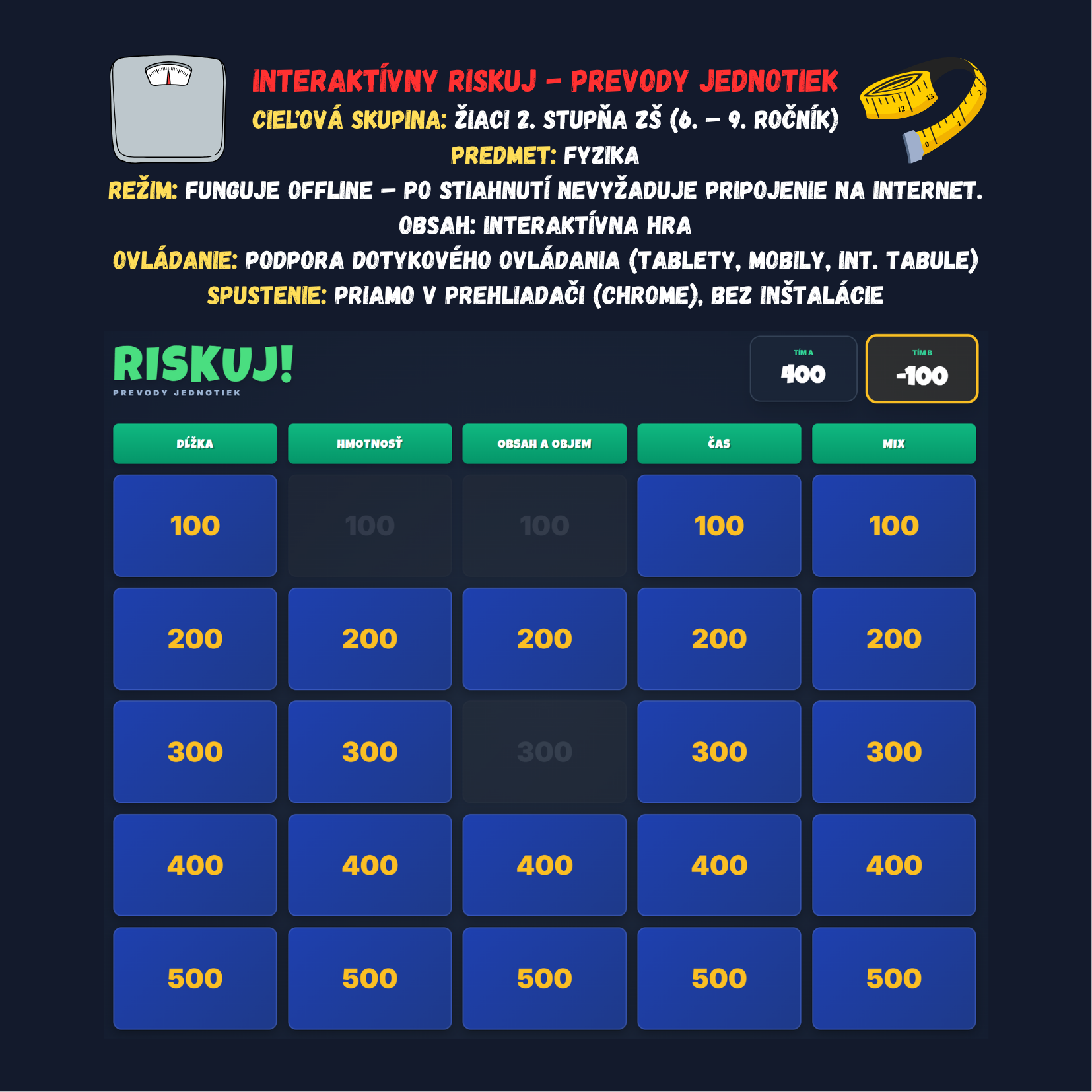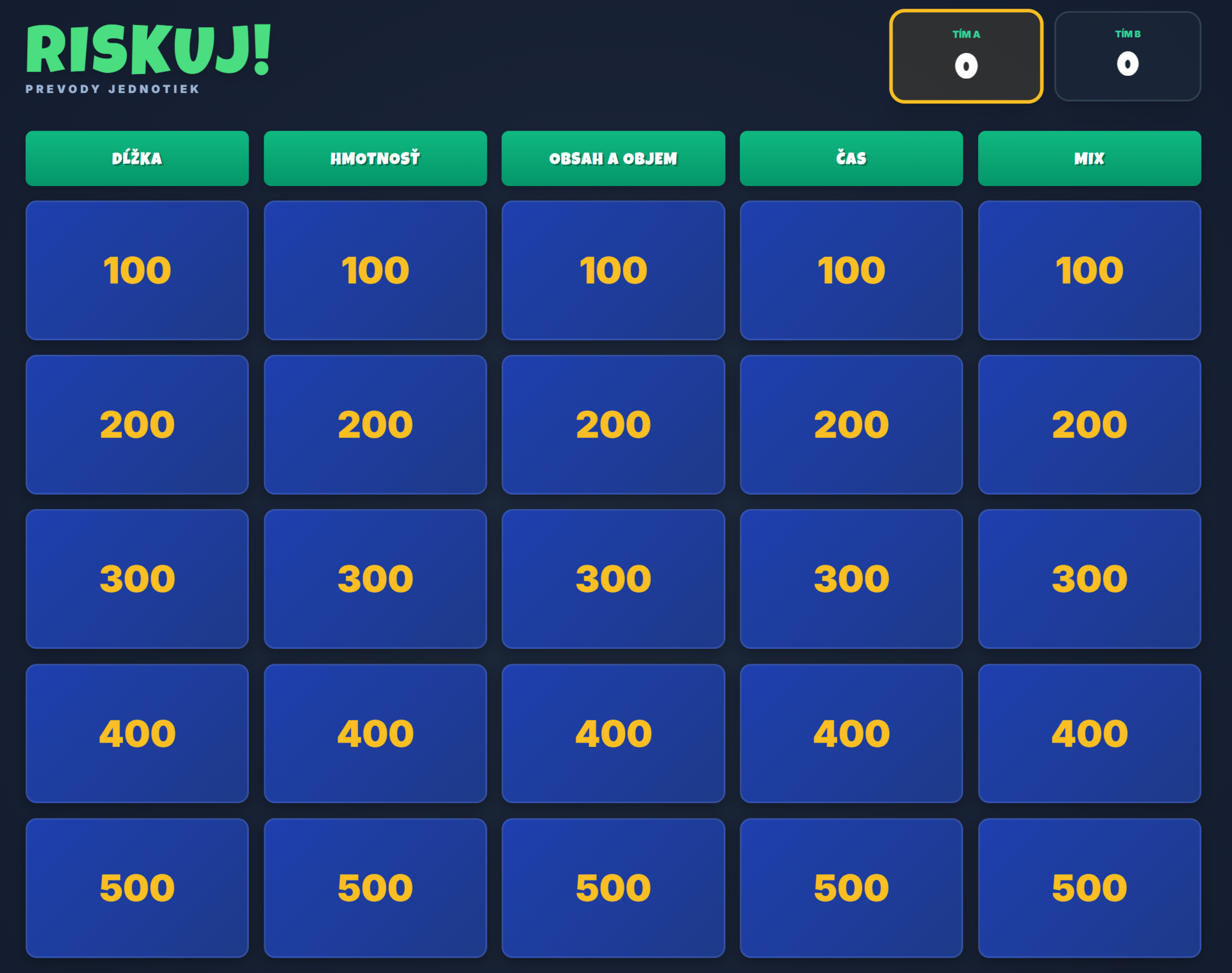 Premeňte obávanú tému prevodov jednotiek na napínavý súboj! Táto digitálna hra prenáša obľúbený formát Riskuj priamo do vašej triedy. Žiaci sa hravou formou naučia bleskovo prevádzať jednotky dĺžky, hmotnosti, času aj objemu pod tlakom časomieru.