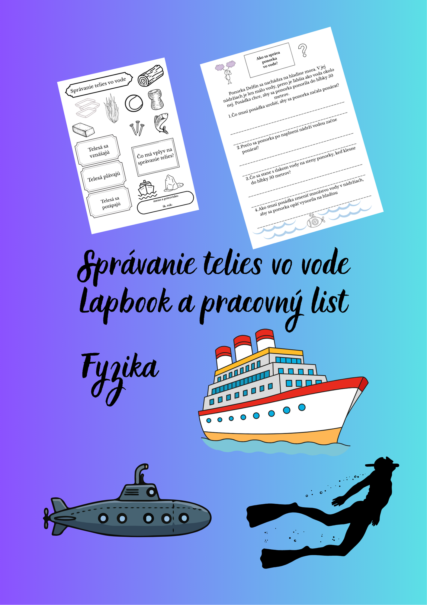 Materiál tvorí: Lapbook (Správanie telies vo vode) na rozvoj tvorivosti žiakov a využitie poznatkov z bežného života a pracovný list, ktorý obsahuje dve úlohy o ponorke a lodi, ktoré patria medzi problémové úlohy s prvkami bádateľského vyučovania.