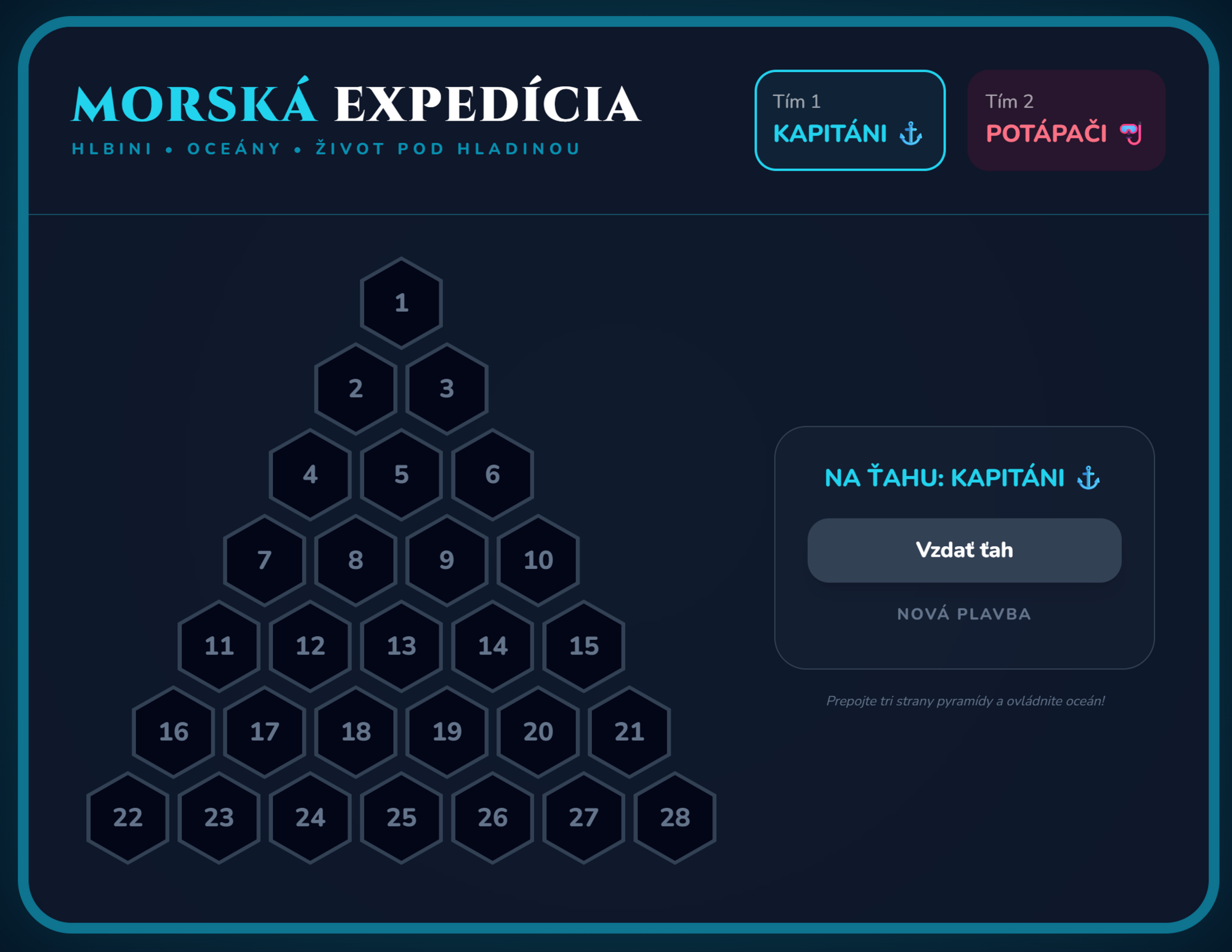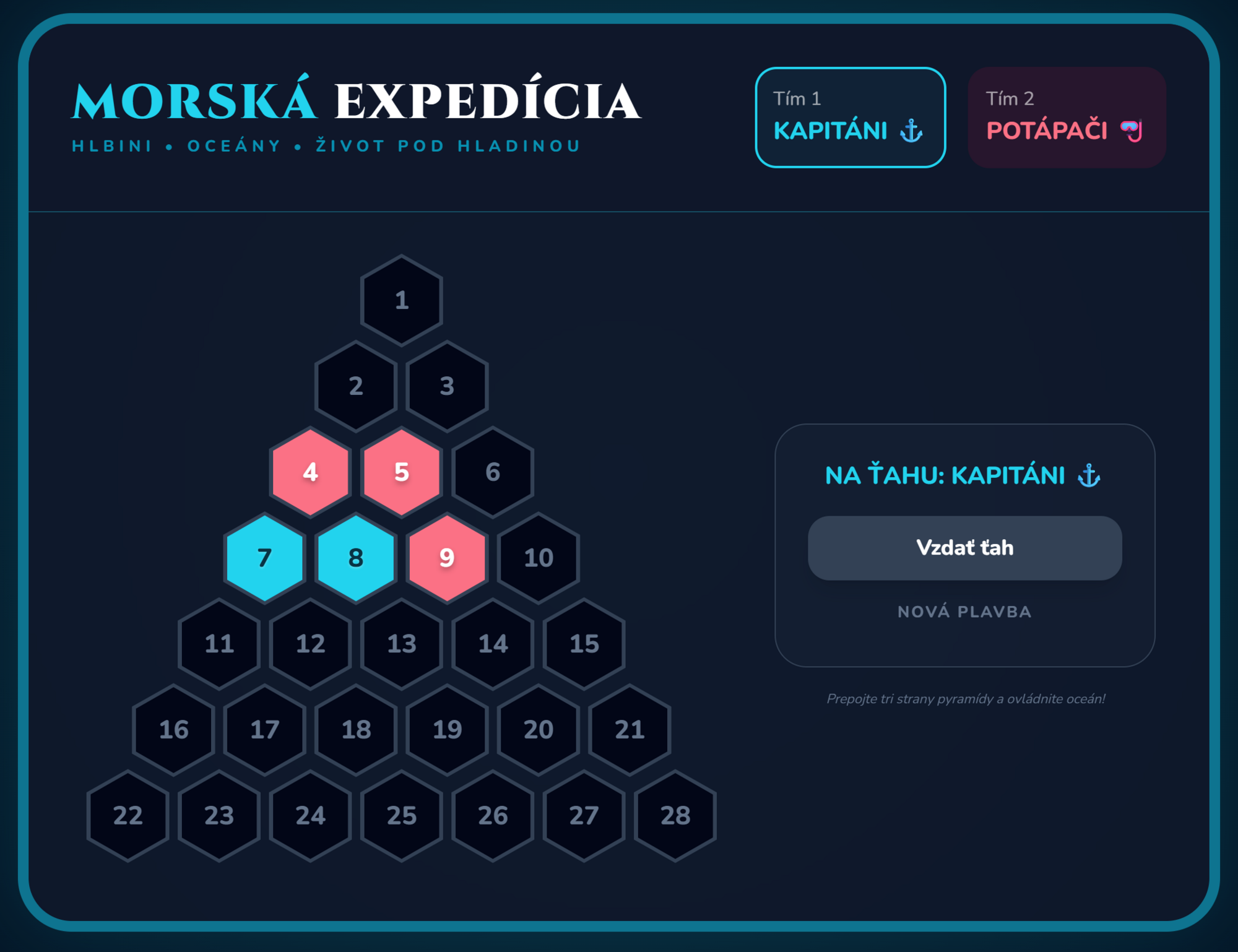 Kompletná herná logika: Automatické striedanie dvoch tímov (Kapitáni vs. Potápači), interaktívne zvukové efekty a pyramídové herné pole.