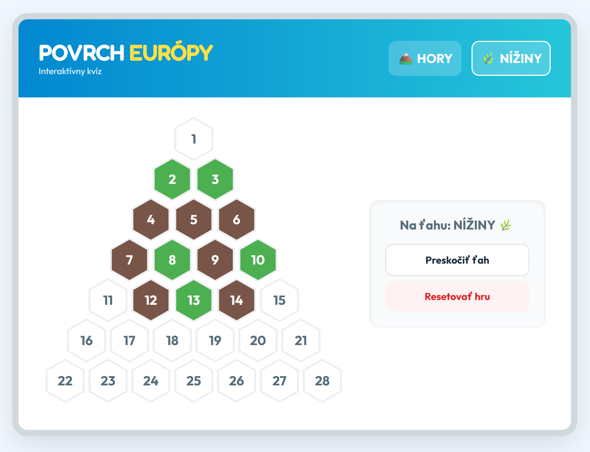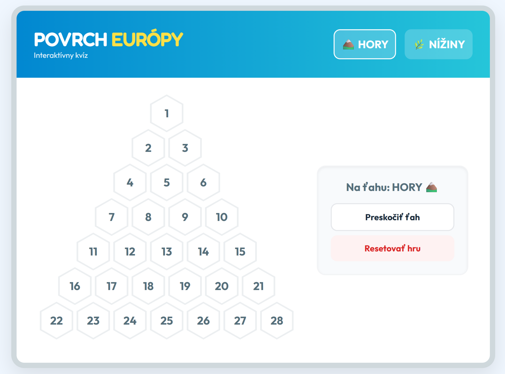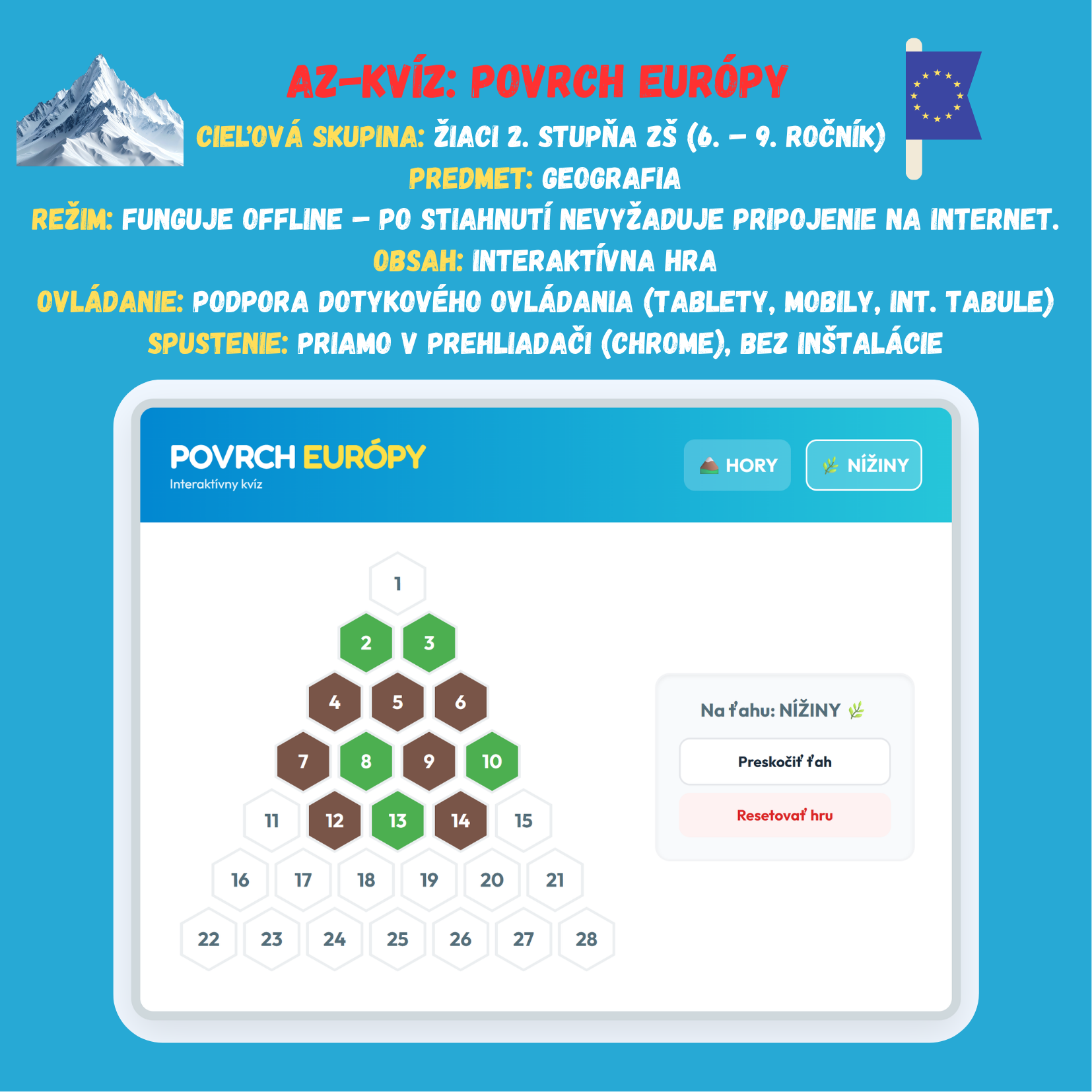 Premeňte hodinu geografie na napínavý súboj medzi tímami Hory a Nížiny! Táto digitálna hra prenáša obľúbený formát AZ-kvízu priamo do vašej triedy. Žiaci sa hravou formou naučia spoznávať významné európske pohoria, najvyššie vrchy, členitosť pobrežia a rozsiahle nížiny nášho svetadiela.