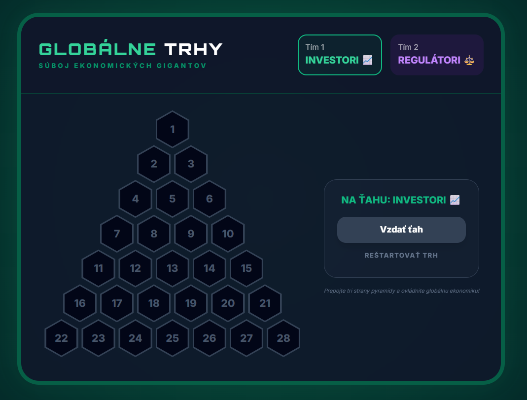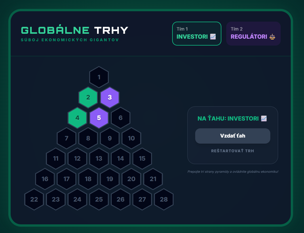 - Kompletná herná logika: Automatické striedanie dvoch tímov (Investori vs. Regulátori), zvukové efekty a interaktívne herné pole.