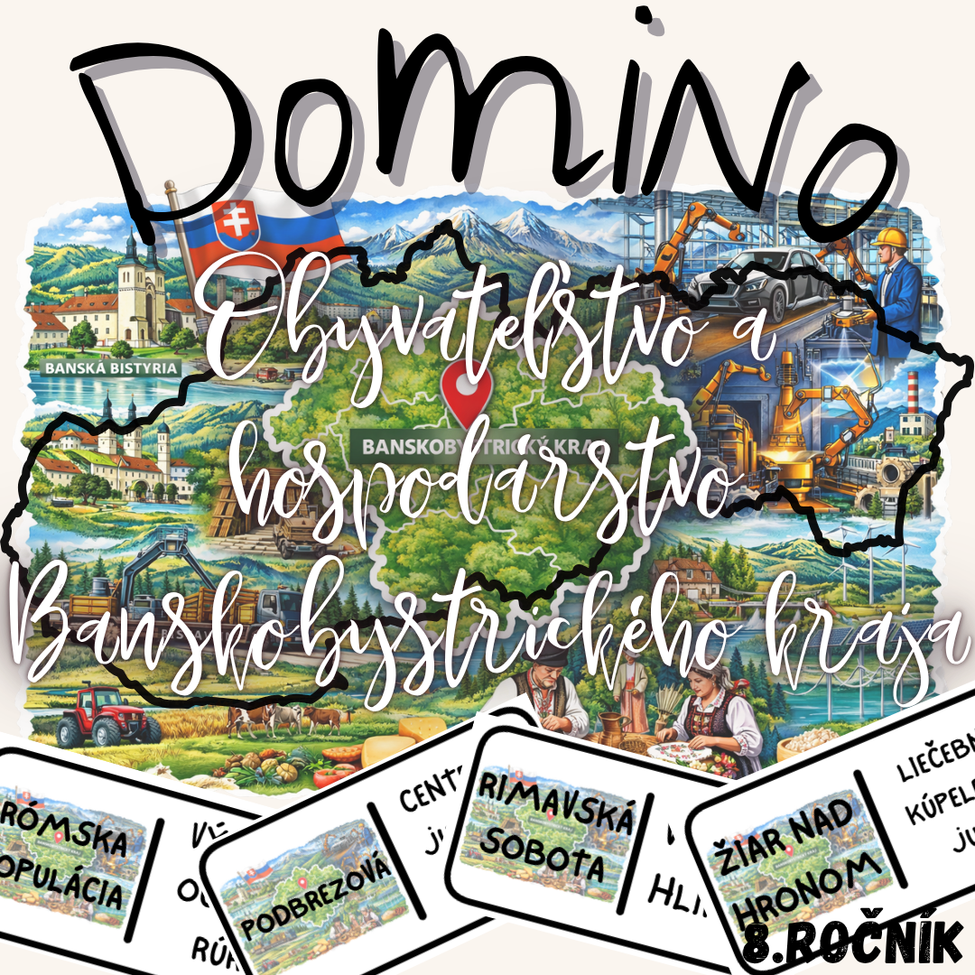 Materiál „Domino – Obyvateľstvo a hospodárstvo Banskobystrického kraja“ je didaktická a názorná edukačná aktivita určená pre žiakov 8. ročníka základnej školy na hodiny geografie. Aktivita je tematicky zameraná na demografické a hospodárske charakteristiky Banskobystrického kraja a pomáha žiakom upevniť si poznatky o jeho význame v rámci Slovenska.