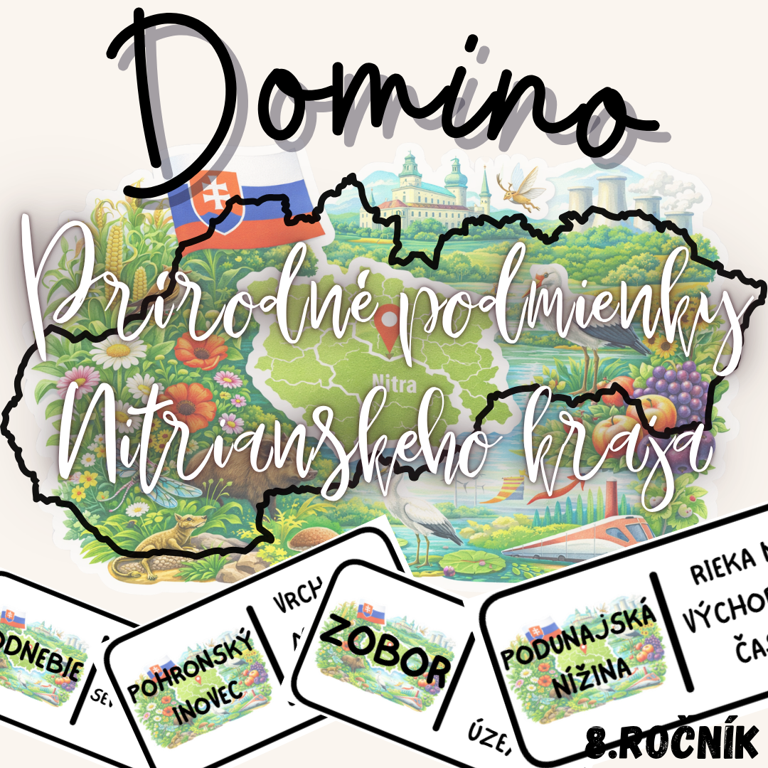 Materiál „Domino – Prírodné podmienky Nitrianskeho kraja“ je didaktická a názorná edukačná aktivita určená pre žiakov 8. ročníka základnej školy na hodiny geografie. Aktivita je tematicky zameraná na prírodné pomery Nitrianskeho kraja a pomáha žiakom upevniť si poznatky o jeho reliéfe, podnebí, vodstve, pôdach a rastlinstve.