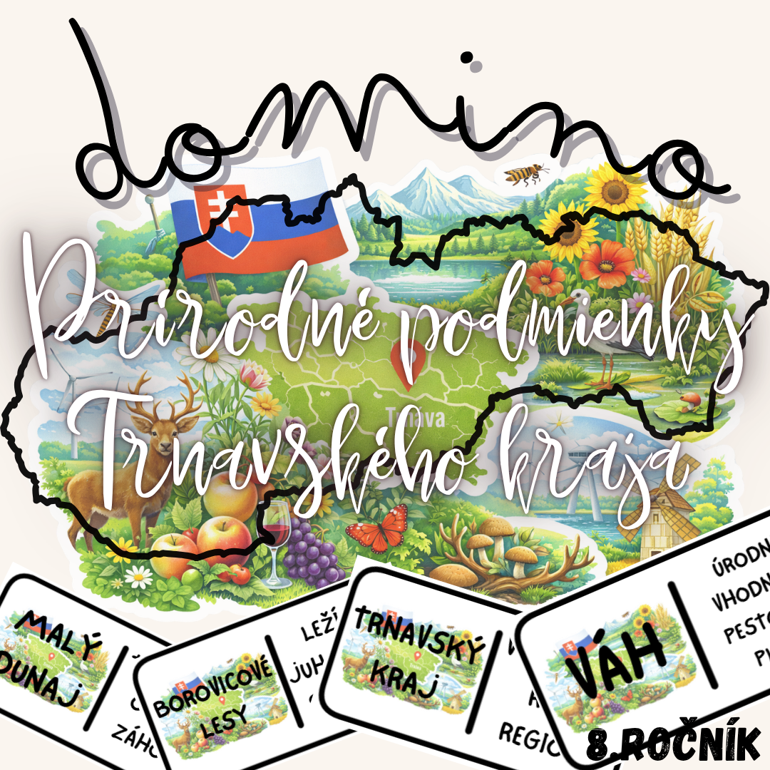 Materiál „Domino – Prírodné podmienky Trnavského kraja“ je didaktická a názorná edukačná aktivita určená pre žiakov 8. ročníka základnej školy na hodiny geografie. Aktivita je tematicky zameraná na prírodné pomery Trnavského kraja a pomáha žiakom upevniť si poznatky o jeho reliéfe, podnebí, vodstve, pôdach a rastlinstve.