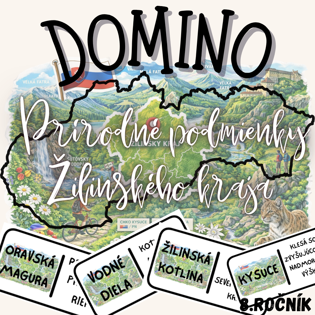 Materiál „Domino – Prírodné podmienky Žilinského kraja“ je didaktická a názorná edukačná aktivita určená pre žiakov 8. ročníka základnej školy na hodiny geografie. Aktivita je tematicky zameraná na prírodné pomery Žilinského kraja a pomáha žiakom upevniť si poznatky o jeho reliéfe, podnebí, vodstve, pôdach a rastlinstve.