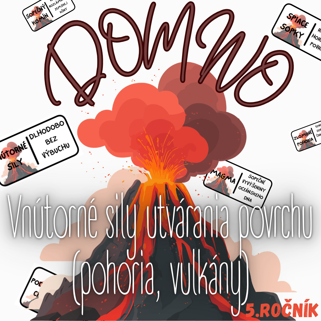 Materiál „Domino – Vnútorné sily utvárania povrchu (pohoria, vulkány)“ je didaktická a hravá edukačná aktivita určená pre žiakov 5. ročníka základnej školy na hodiny geografie. Prostredníctvom práce s domino kartičkami si žiaci upevňujú poznatky o vnútorných silách Zeme, ktoré formujú zemský povrch a podieľajú sa na vzniku pohorí a sopečnej činnosti.