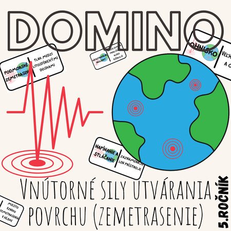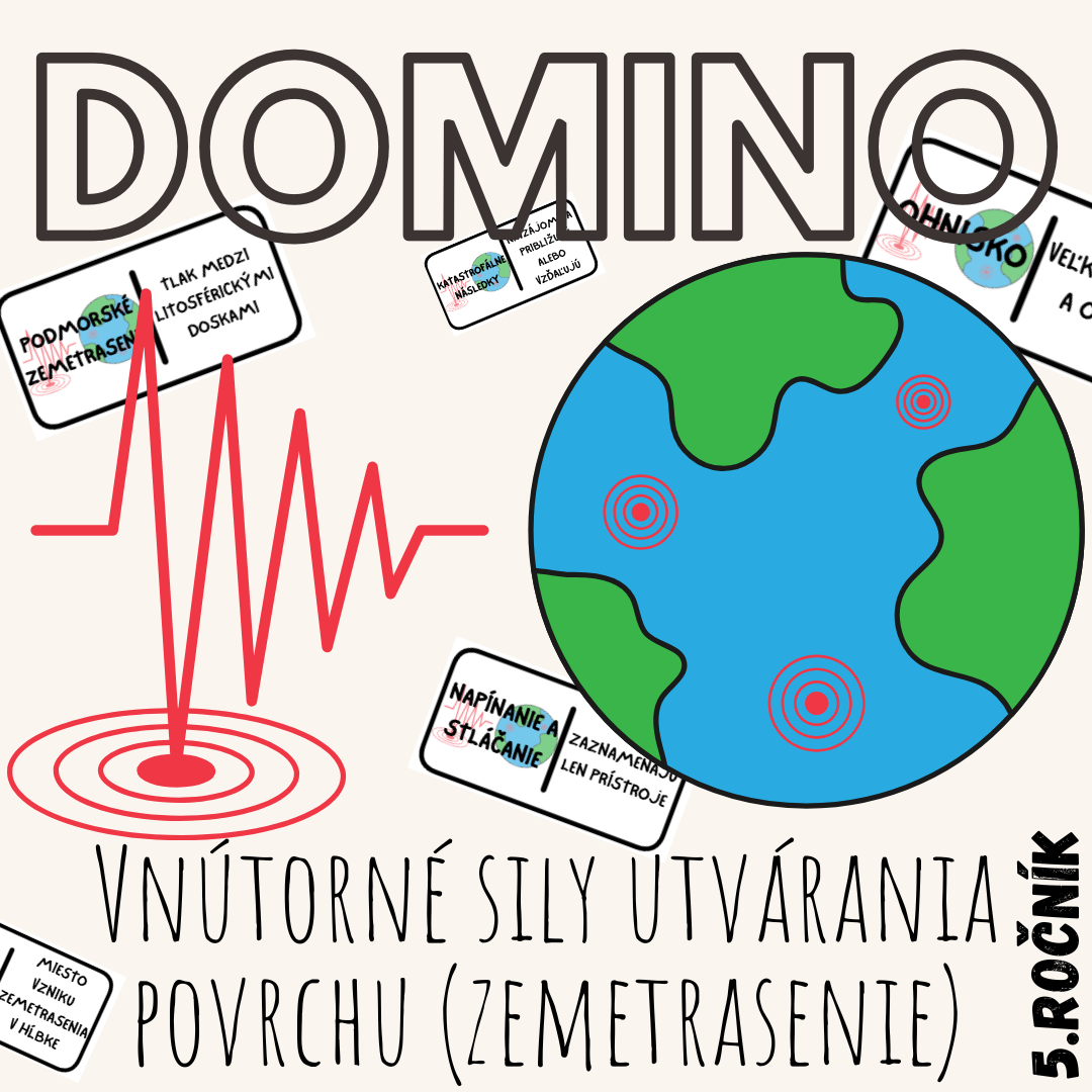 Materiál „Domino – Vnútorné sily utvárania povrchu (zemetrasenie)“ je didaktická a hravá edukačná aktivita určená pre žiakov 5. ročníka základnej školy na hodiny geografie. Prostredníctvom práce s domino kartičkami si žiaci upevňujú poznatky o zemetrasení ako prejave vnútorných síl Zeme, jeho príčinách, prejavoch a dôsledkoch.