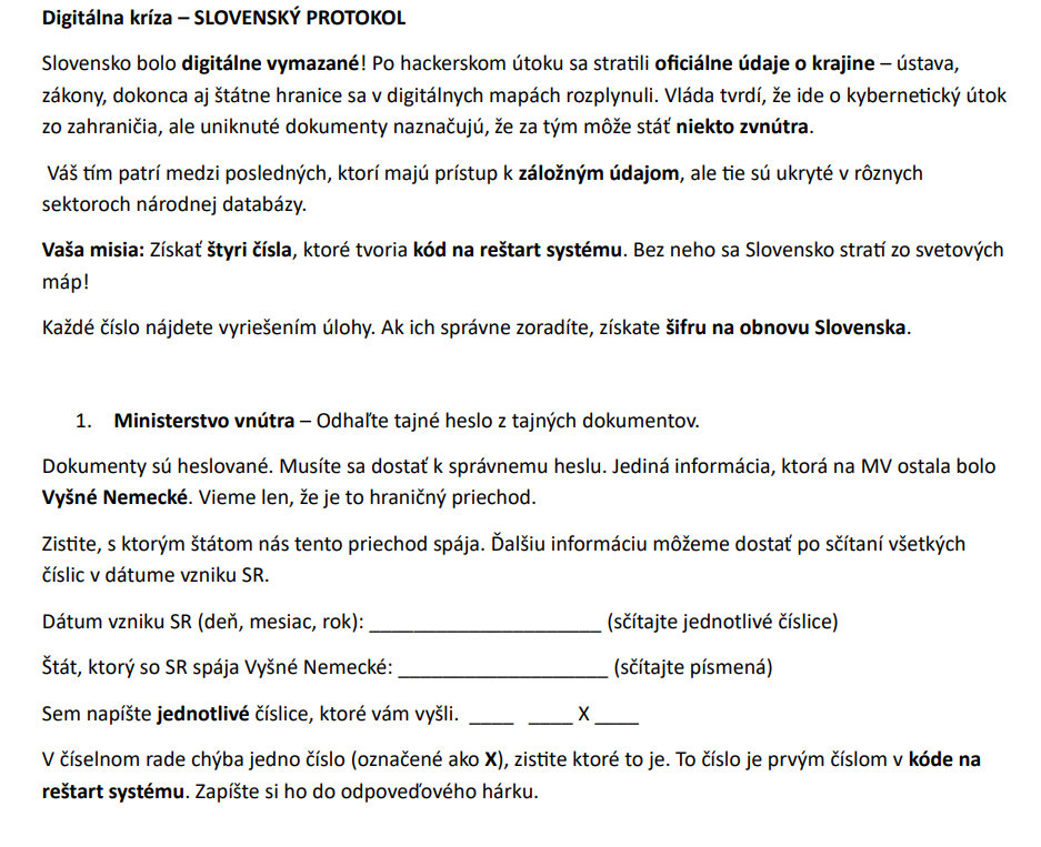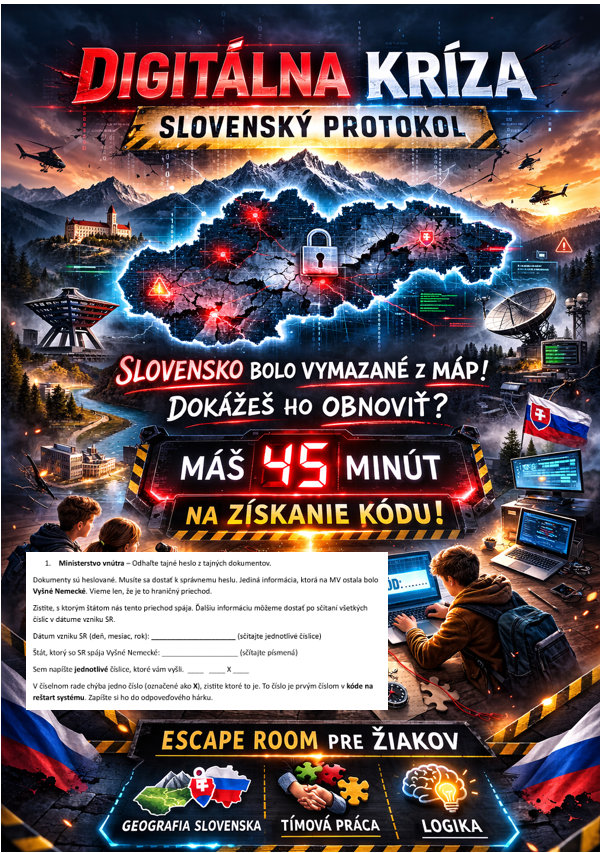 Escape room je zameraná na opakovanie učiva celého roka geografie Slovenska. Žiaci pri vypracovaní môžu použiť atlas Slovenska. ER je na celú hodinu a prácu v skupinách. V dokumente sú aj správne možnosti. Výhrou môže byť známka, avšak hra sa dá ozvláštniť truhlicou a zámkou s číselným kódom. Obrázok v náhľade bol vytvorený pomocou AI. Súbor je možné využiť ako brožúru.