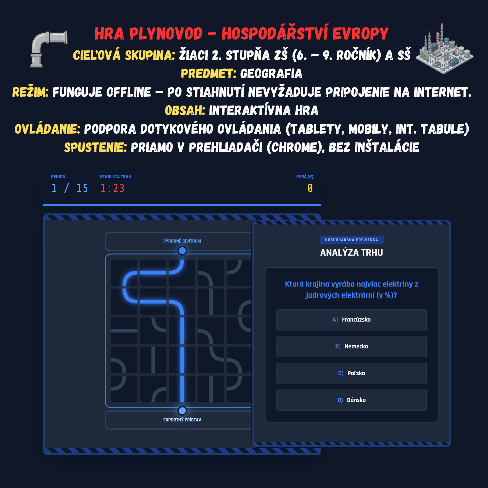 Cieľ aktivity: Precvičiť učivo o hospodárstve Európy modernou, gamifikovanou formou, ktorá rozvíja nielen znalosti, ale aj logické myslenie a strategické rozhodovanie pod tlakom.