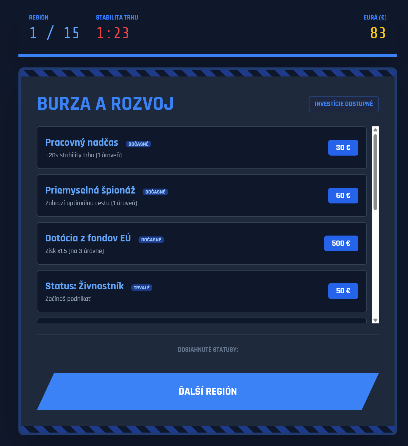 - Dynamický herný systém: Hráči zarábajú eurá (€), za ktoré v integrovanom obchode nakupujú vylepšenia (Pracovné nadčasy, Priemyselná špionáž) alebo prestížne statusy (Investor, Miliardár, Magnát).