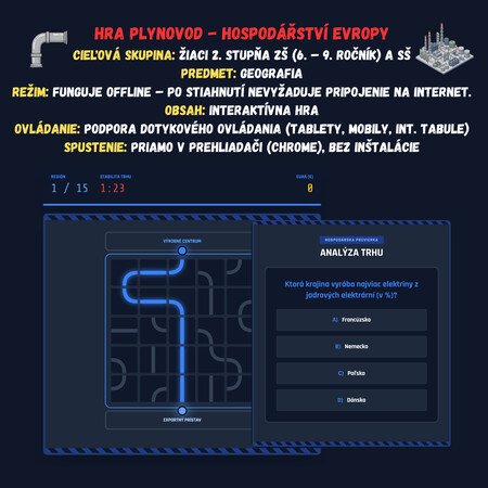 - Logická minihra: Každá správna odpoveď odomyká cestu k „plynovodu“, ktorý musia žiaci v časovom limite správne poskladať, aby tovar dorazil do prístavu.