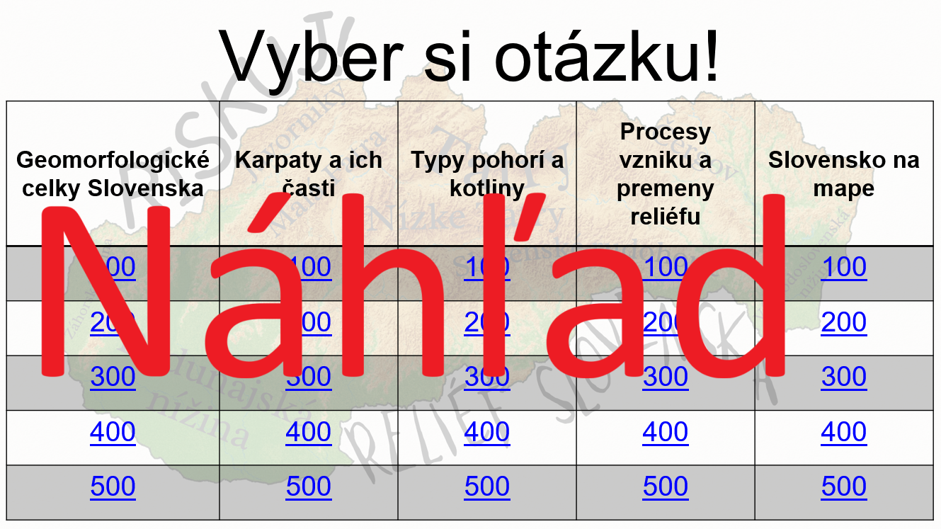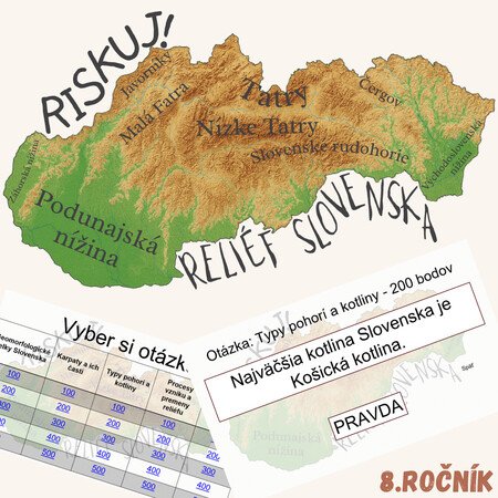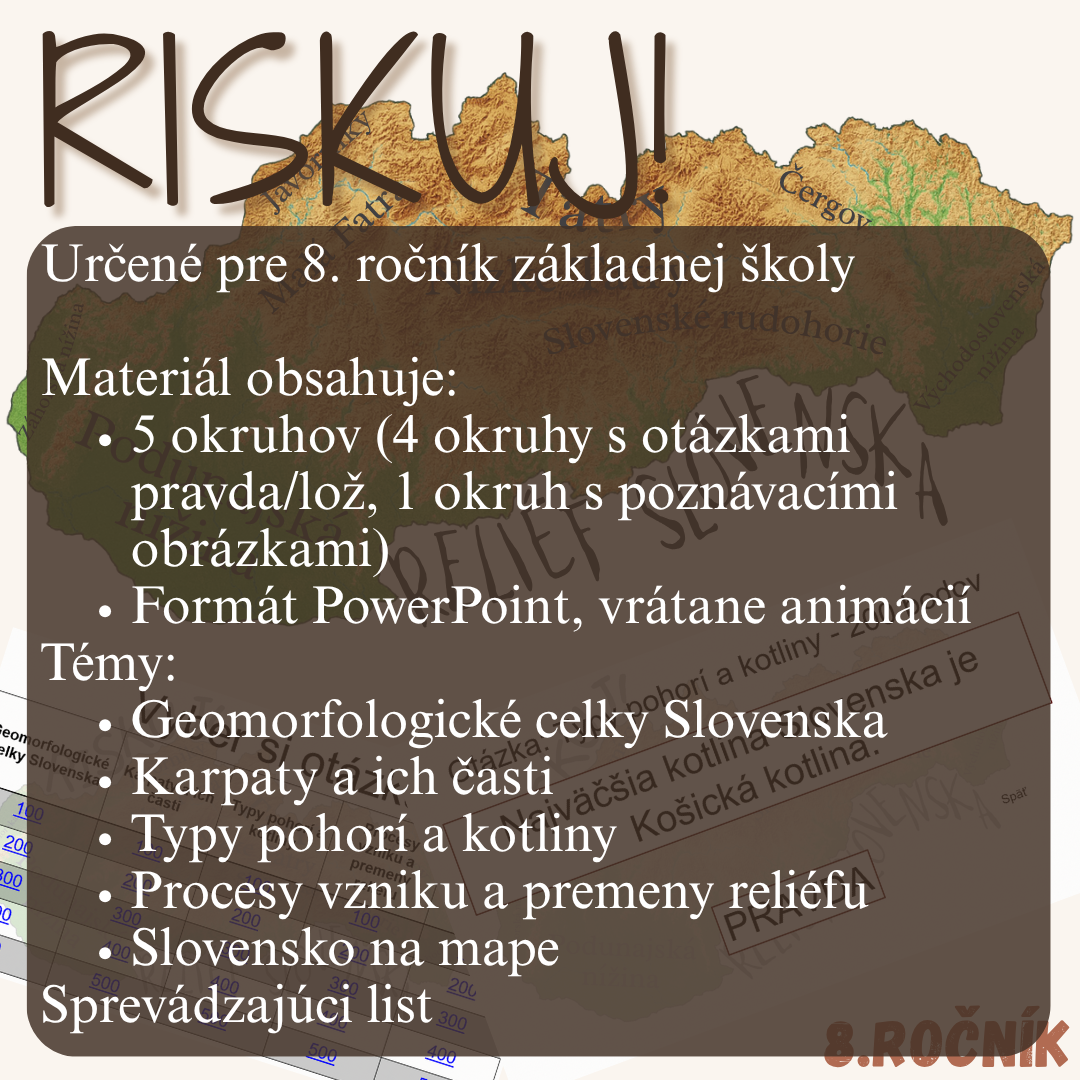 Materiál RISKUJ! – Reliéf Slovenska je interaktívna a súťažná učebná pomôcka, ktorá pomáha žiakom 8. ročníka zopakovať a prehĺbiť učivo o tvare povrchu Slovenska, geomorfologických celkoch a procesoch, ktoré formujú krajinu.