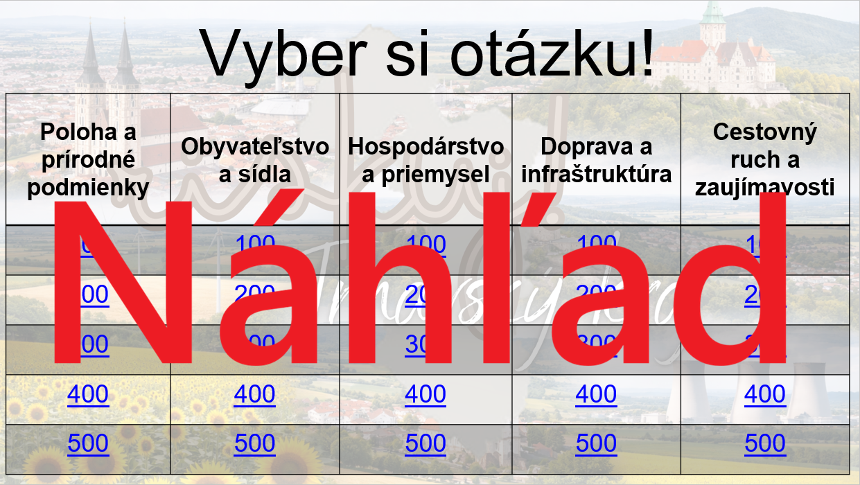 🔹 5 tematických okruhov s otázkami (100 – 500 bodov),