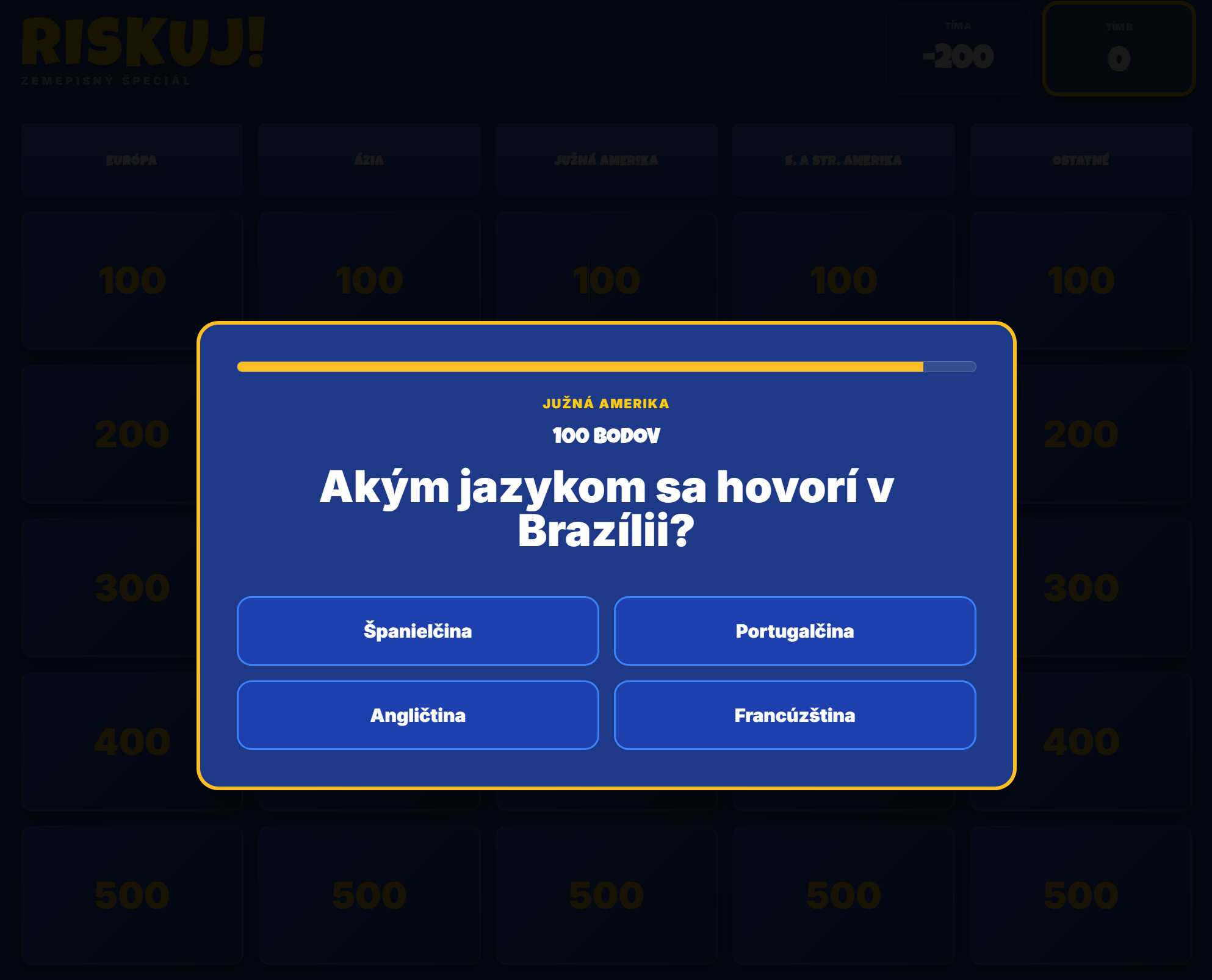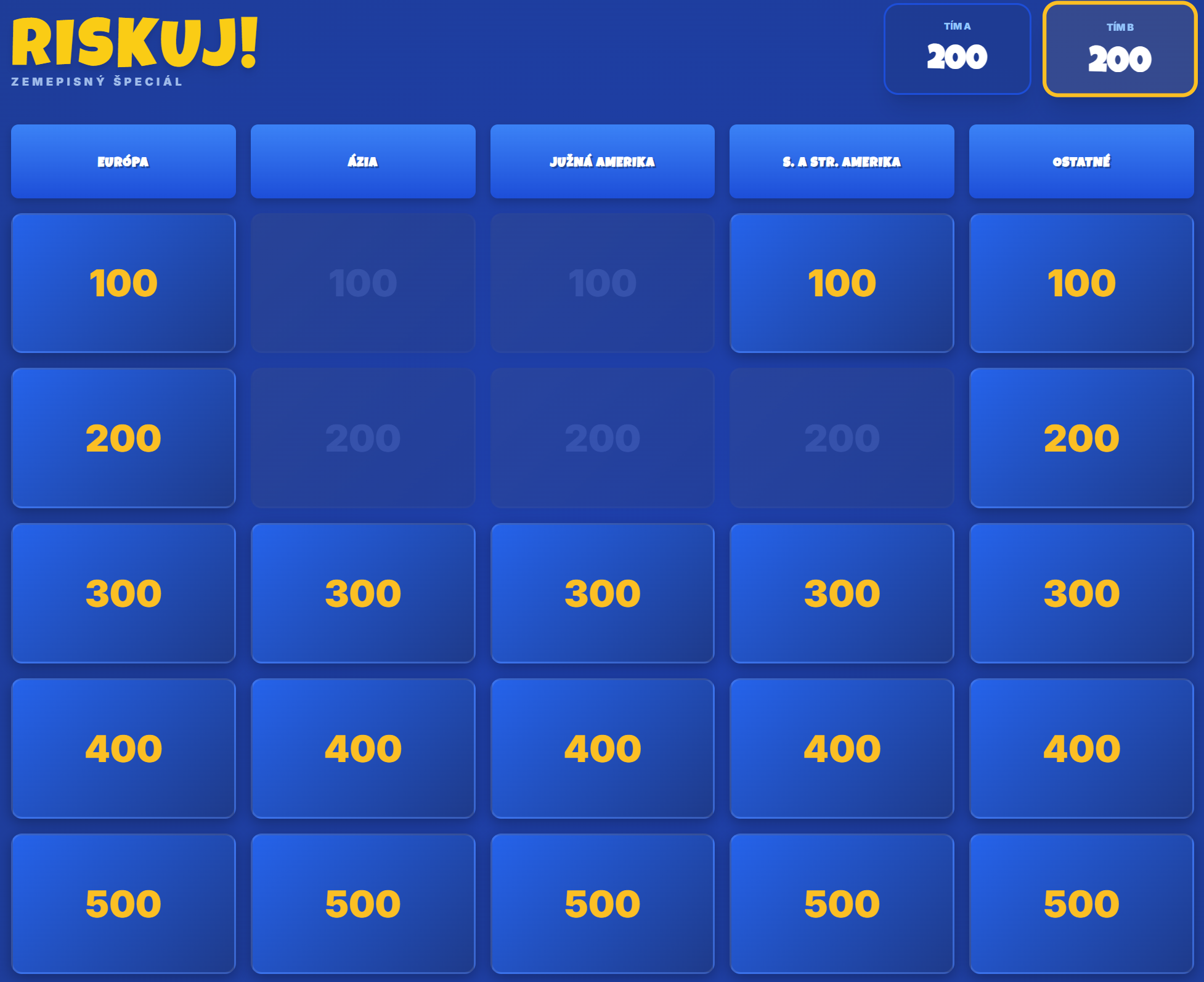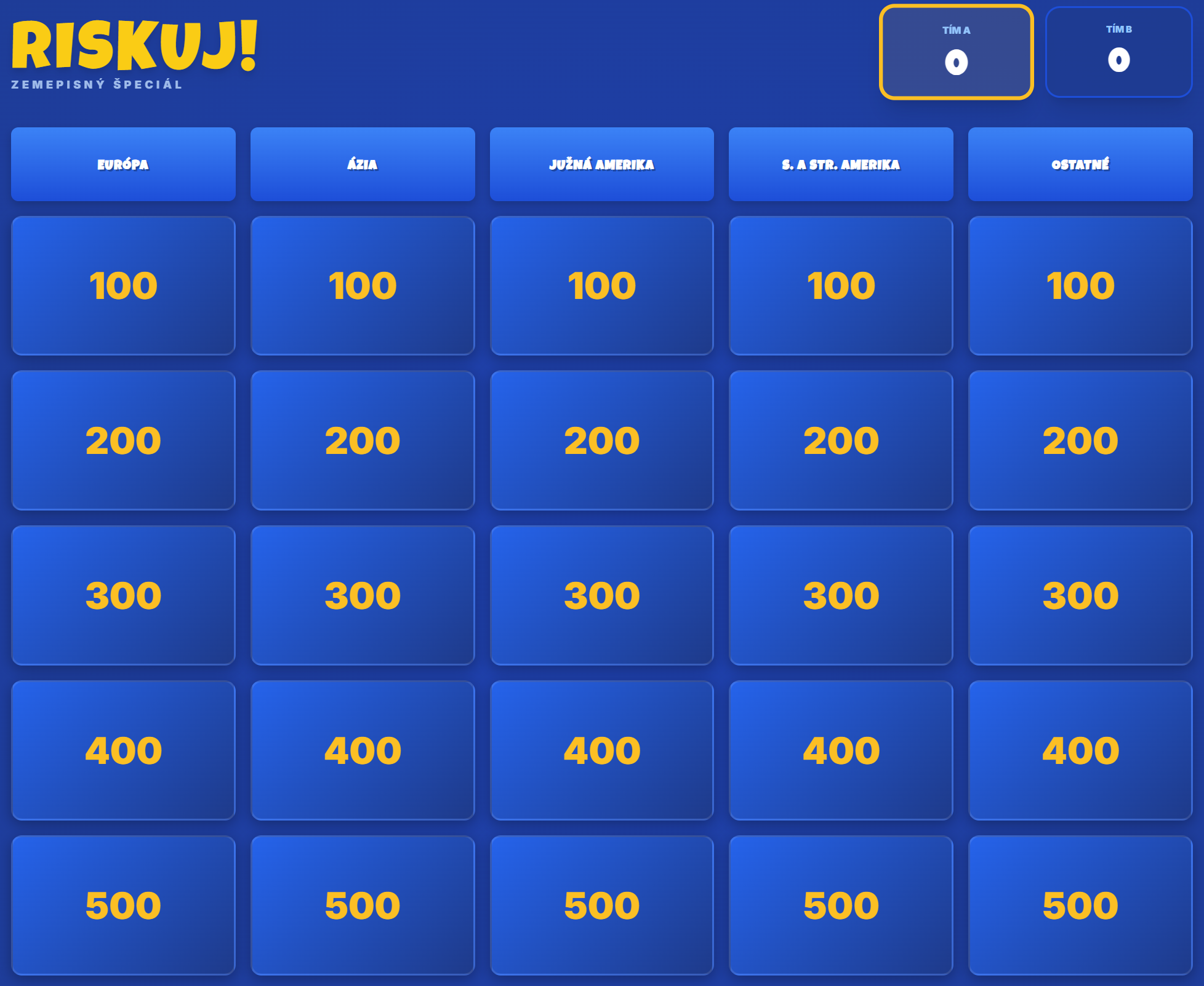 - Priebeh: Tímy sa striedajú vo výbere otázok; po kliknutí na políčko sa zobrazí otázka so štyrmi možnosťami a spustí sa 30-sekundový časový limit.