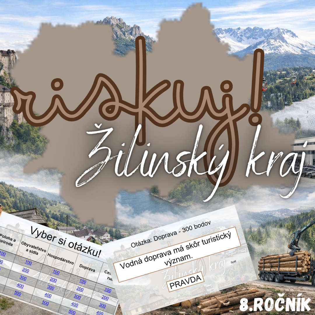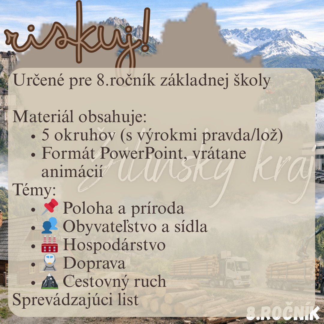 Materiál „RISKUJ! – Žilinský kraj“ je interaktívna a súťažná edukačná hra určená pre žiakov 8. ročníka základnej školy na hodiny geografie. Tematicky je zameraná na komplexné poznanie Žilinského kraja z hľadiska polohy, prírodných podmienok, obyvateľstva, hospodárstva, dopravy a cestovného ruchu.