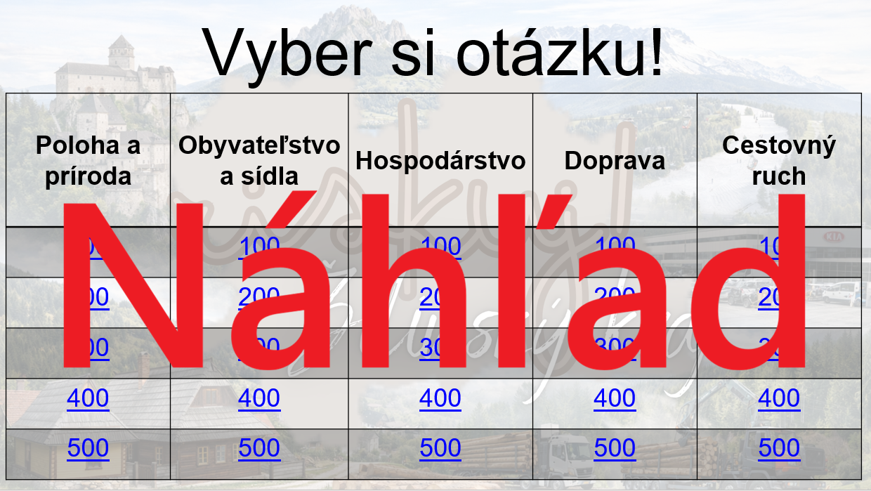 🔹 5 tematických okruhov s otázkami (100 – 500 bodov),