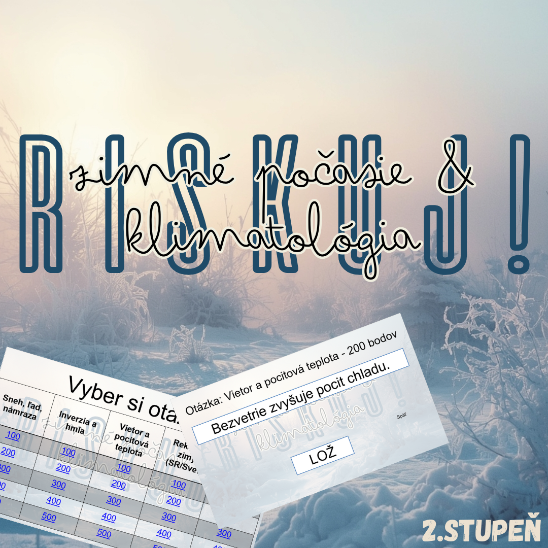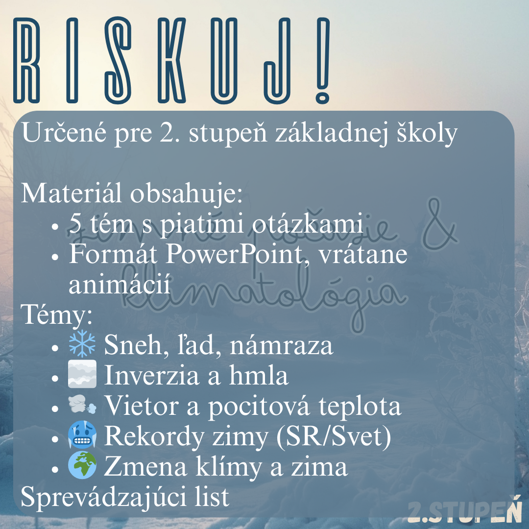 Materiál „RISKUJ! – Zimné počasie & klimatológia“ je interaktívna vzdelávacia hra, ktorá žiakom 2. stupňa zábavným spôsobom vysvetľuje zimné poveternostné javy, základné meteorologické pojmy a súvislosti medzi počasím a klimatickou zmenou.
