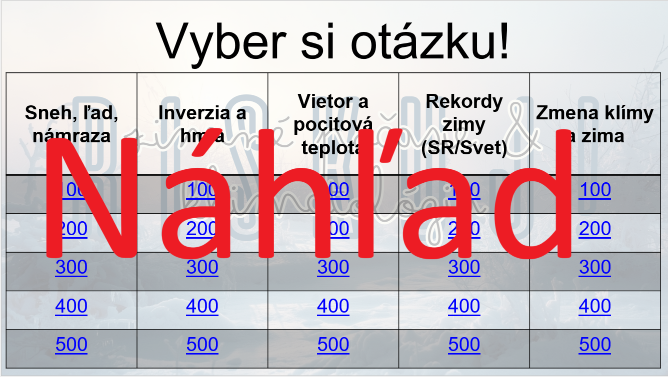 🔹 5 tematických okruhov s otázkami v hodnote 100–500 bodov,