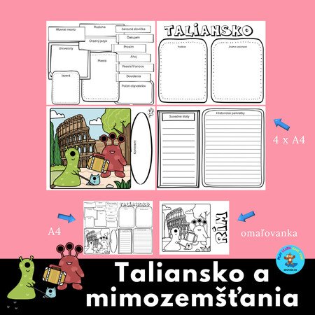 Poďme sa spoločne s mimozemšťanmi kamarátmi zoznámiť s nádhernou krajinou v srdci Európy, Talianskom . Mimozemšťania navštívili hlavné mesto Rím a nezabudli sa odfotiť pri Koloseum. V súbore nájdete omaľovanku mimozemšťanov v Ríme, plagát k spoločnej práci 4XA4 a samostatný pracovný list A4. Žiaci doplnia údaje ktoré sa naučili alebo naučia samostatnou prácou. Základné údaje: susedné štáty, university, tradície, jazerá, mestá, známe osobnosti, kontinent, historické pamiatky, úradný jazyk, počet obyvateľov a niekoľko čarovných slovíčok.