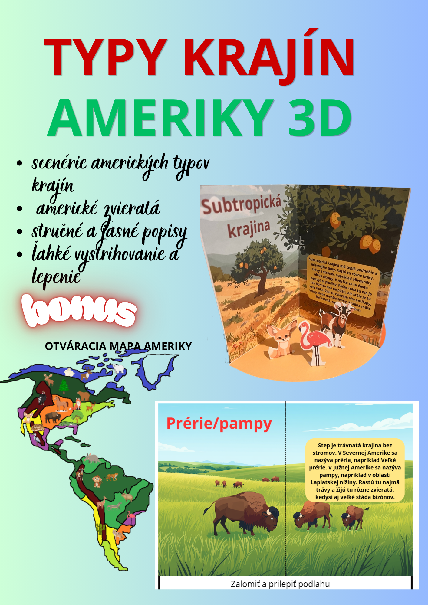 Interaktívny a názorný materiál na vyučovanie geografie, ktorý pomáha žiakom pochopiť rozloženie prírodných krajín v Amerike.