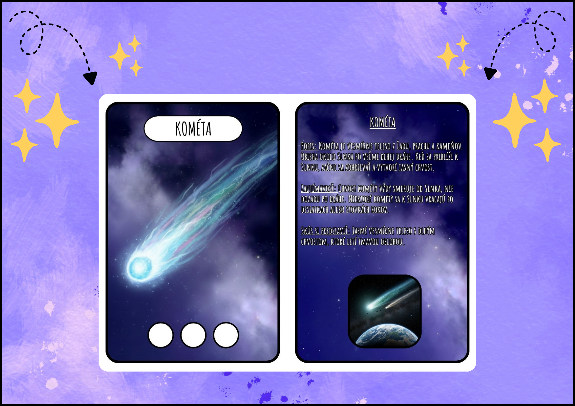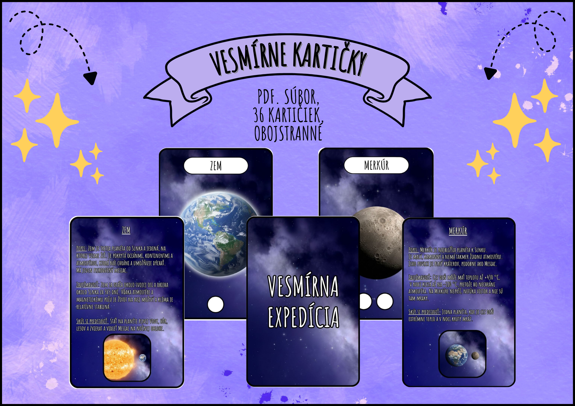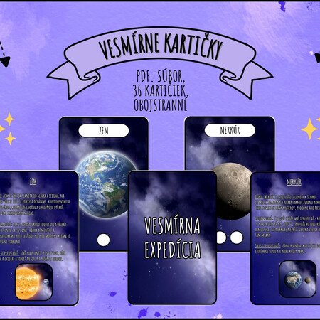 Milé pani učiteľky, učitelia, rodičia, táto sada obsahuje 36 kartičiek, ktoré deťom hravou a zrozumiteľnou formou približujú vesmír. Kartičky predstavujú planéty slnečnej sústavy, Slnko, Mesiac, súhvezdia a ďalšie zaujímavé vesmírne objekty, ako sú kométy, asteroidy, meteority či čierne diery.