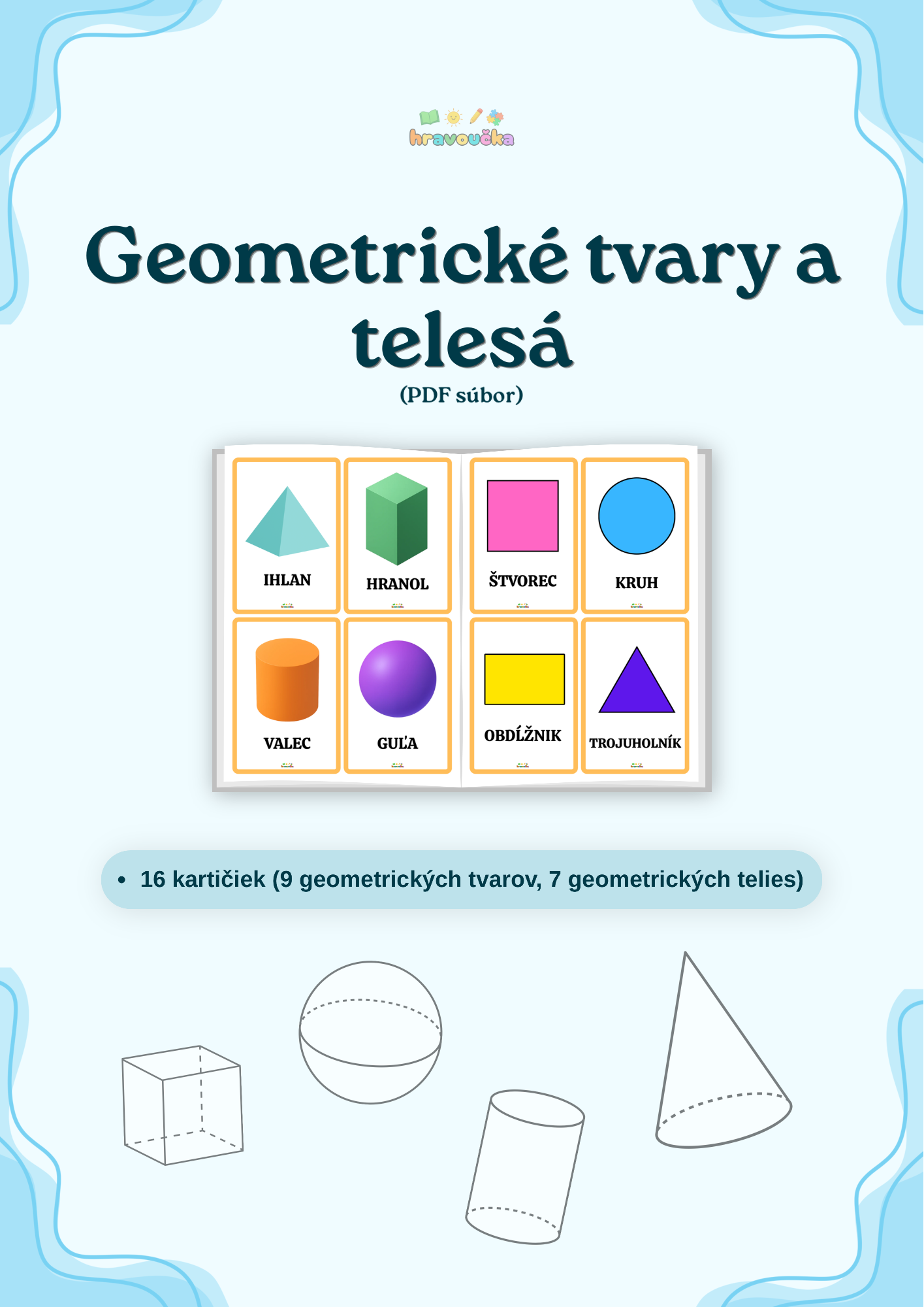 - 7 geometrických telies (ihlan, hranol, valec, guľa, kocka, kváder, kužeľ).