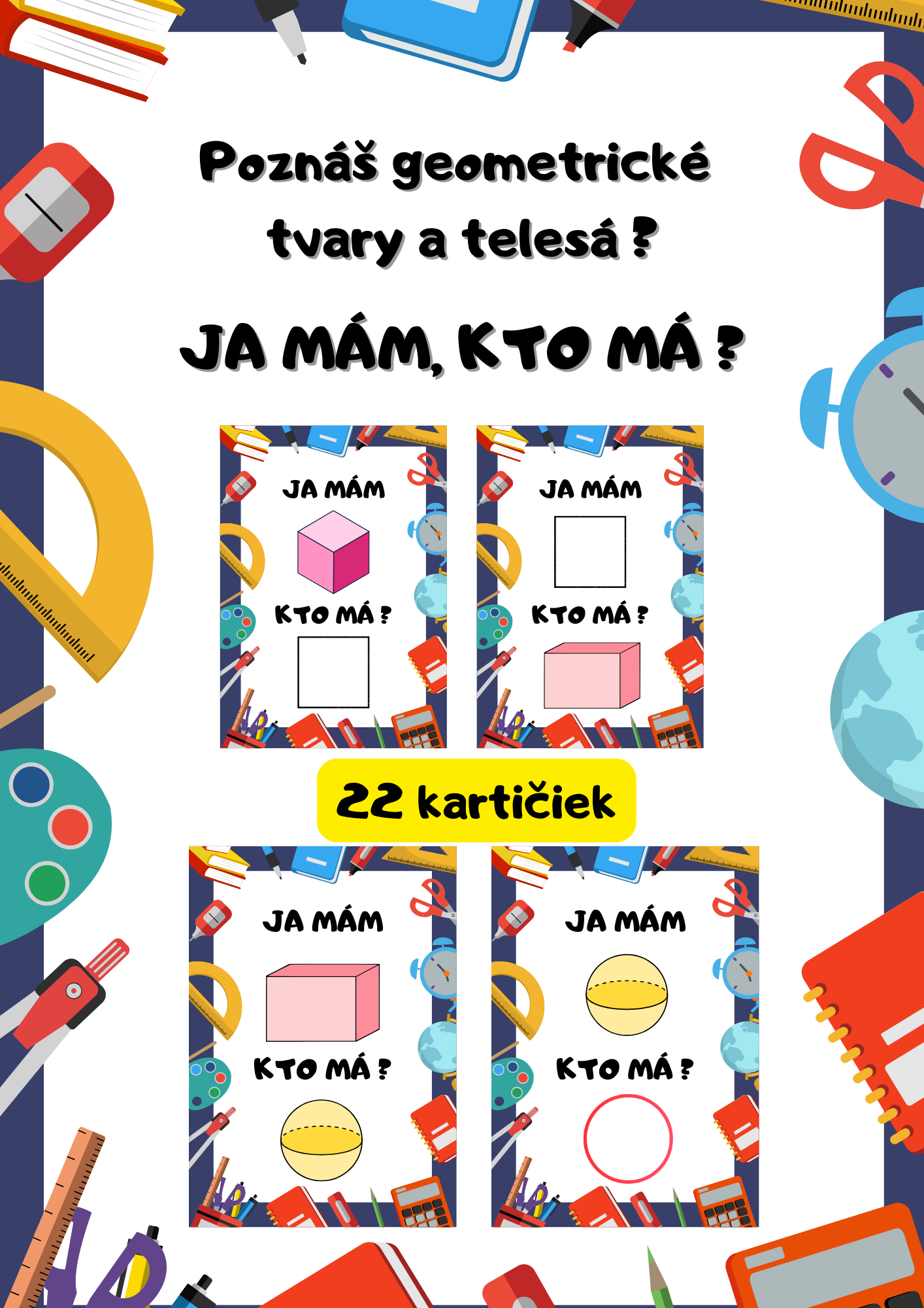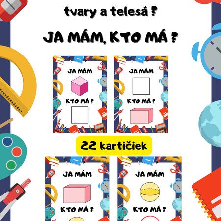 Aktivita obsahuje 22 kartičiek na tému geometrické tvary a telesá. Hrá rozvíja pozornosť, vnímanie, pamäť a logické myslenie.