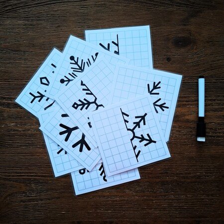 Aktivita spája výtvarnú oblasť s matematikou. U detí podporí rozvoj priestorovej orientácie a geometrického myslenia. Obsahuje 5 strán formátu A4, na ktorých sa nachádza 10 kariet na trénovanie osovej súmernosti. Veľkosť jednej karty je 12x12 cm. Na karty môžu deti kresliť alebo je možné ich aj zalaminovať a pomocou stierateľnej fixky ich používať opakovane.