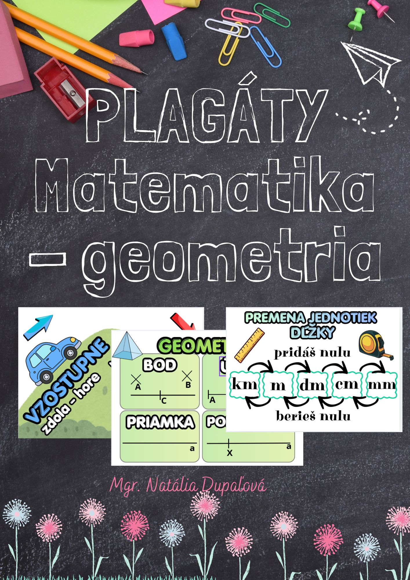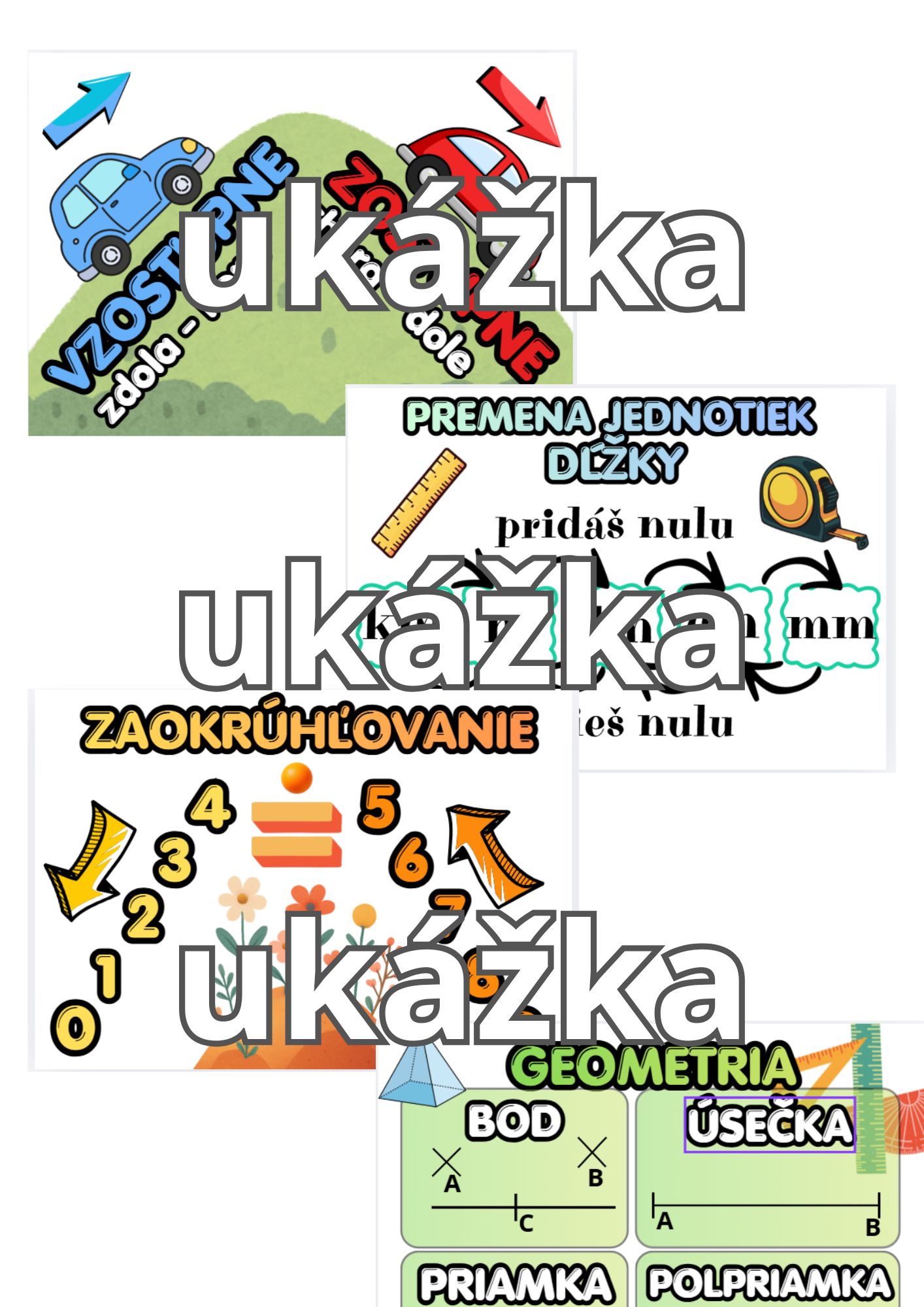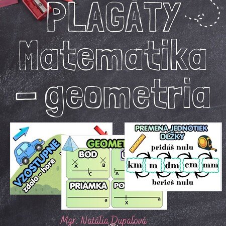 Vytvorila som pre svojich žiakov plagáty s učivom z matematiky a geometrie, ktoré im robí problém. Nájdete tu jednotky dĺžky, premenu jednotiek dĺžky, zaokrúhľovanie, pojmy vzostupne a zostupne a tiež základné pojmy geometrie.