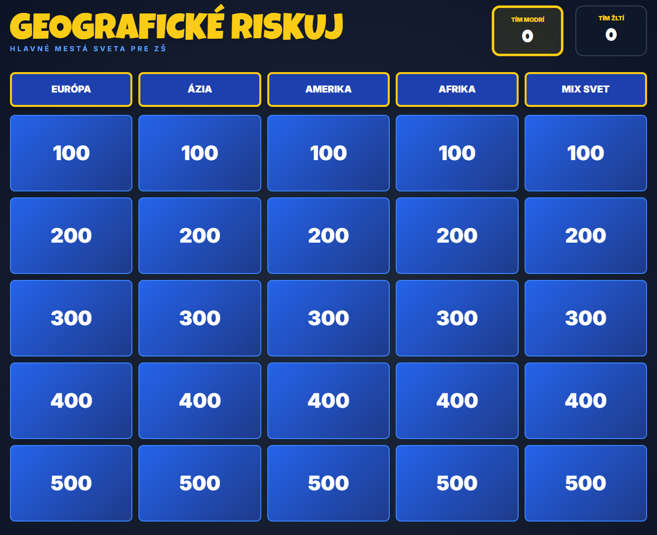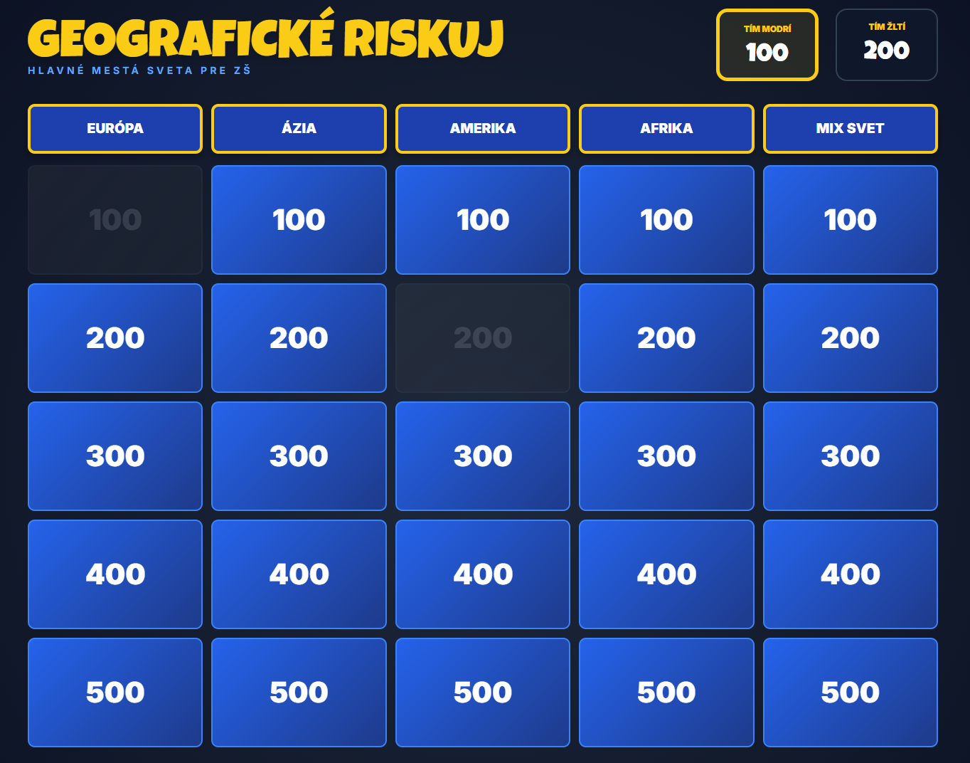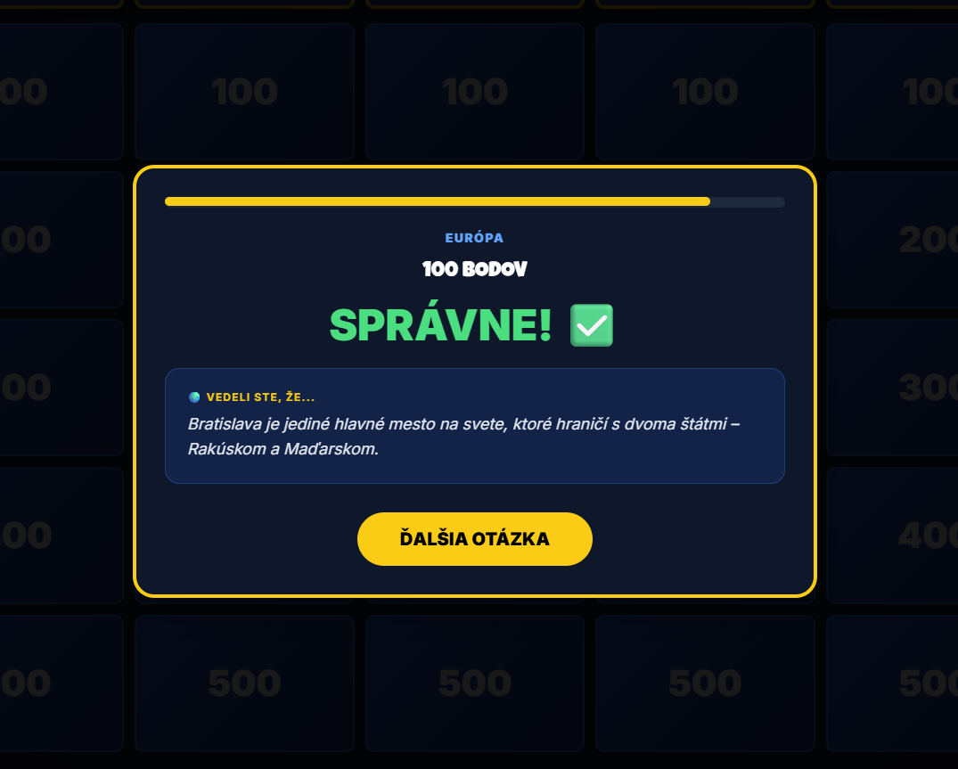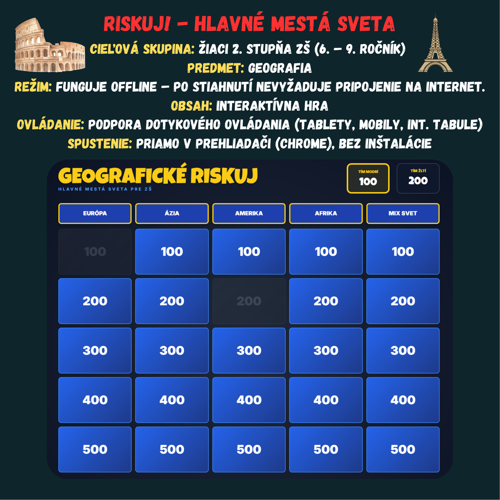 Premeňte hodinu geografie na napínavý súboj vedomostí! Táto digitálna hra prenáša obľúbený formát televíznej súťaže Riskuj! priamo do vašej triedy. Žiaci sa hravou formou ponoria do objavovania svetových metropol, od susednej Bratislavy až po exotický Bangkok.