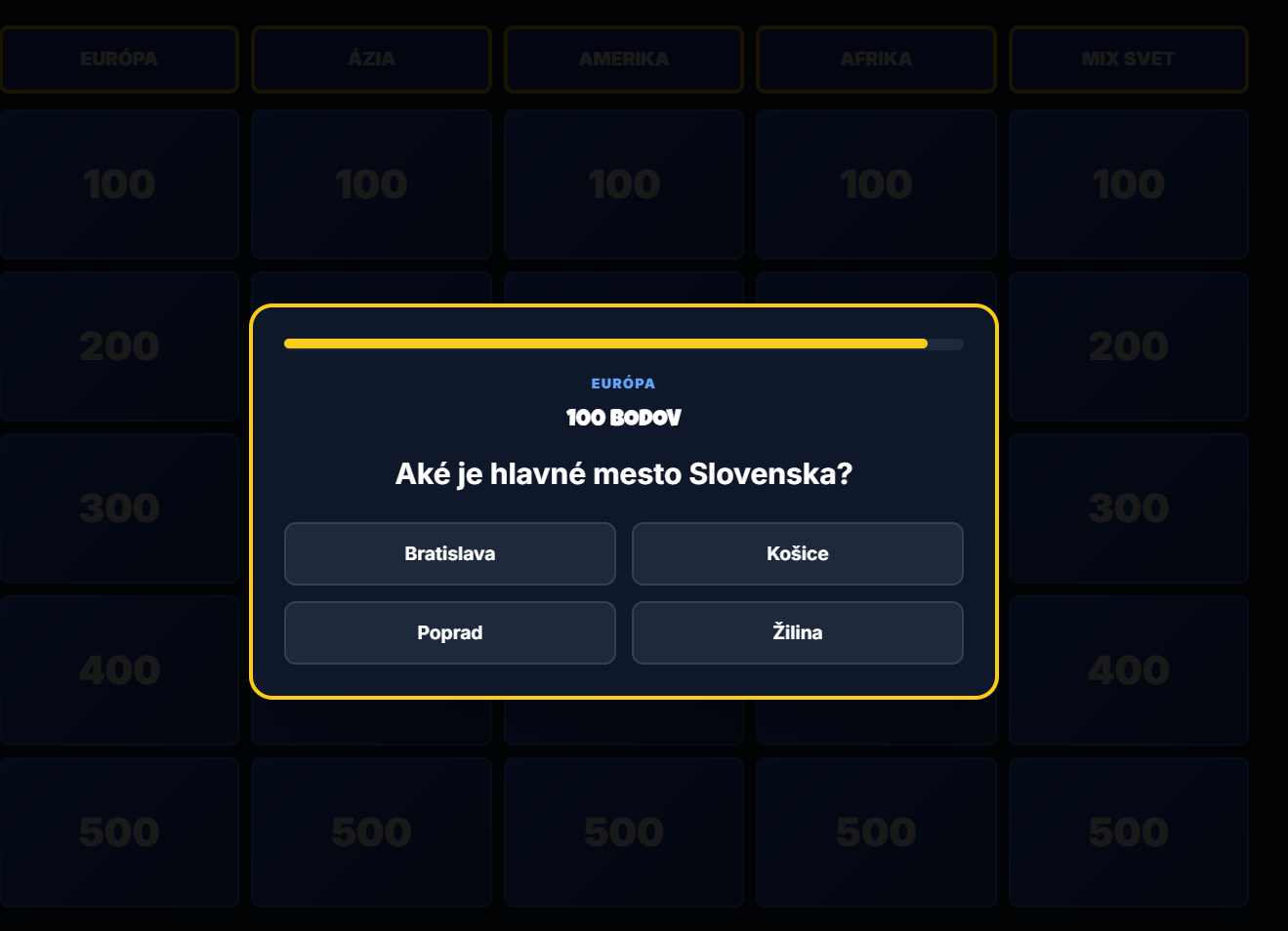 - 25 odborných otázok: Rozdelených do piatich kategórií (Európa, Ázia, Amerika, Afrika a Mix svet).