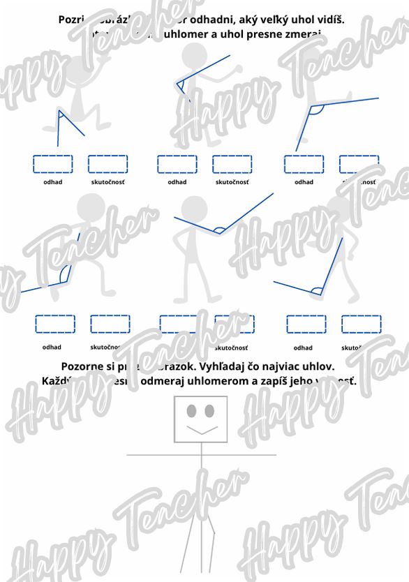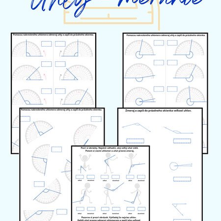 Tento materiál /9 strán pracovných listov/ je navrhnutý tak, aby žiakov postupne a prirodzene previedol od jednoduchého merania uhlov až po meranie uhlov na skutočných predmetoch – hoci len v papierovej podobe.