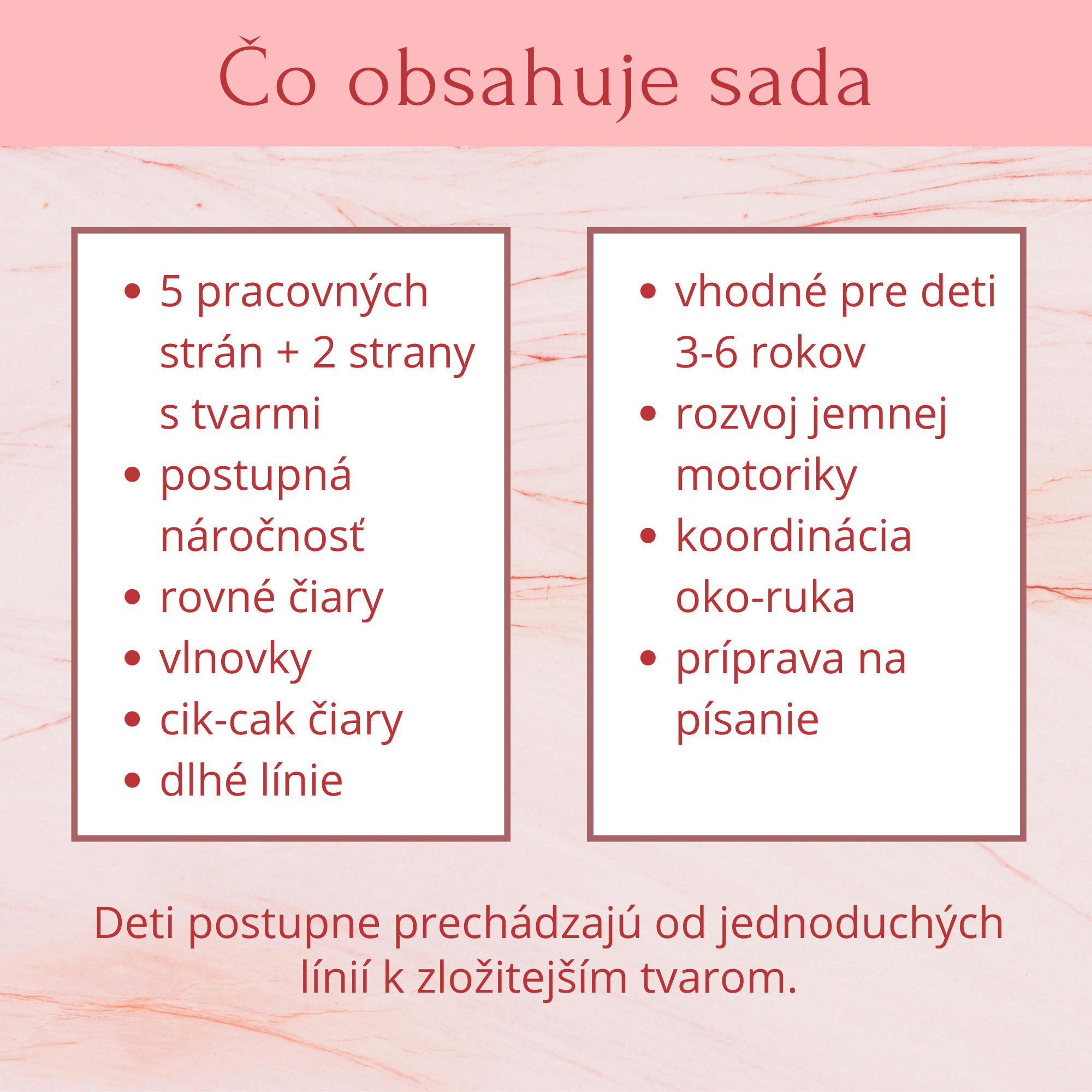 Materiál rešpektuje prirodzenú postupnosť – od krátkych rovných strihov cez šikmé čiary, vlnovky, cik-cak čiary a dlhšie línie až po tvary.