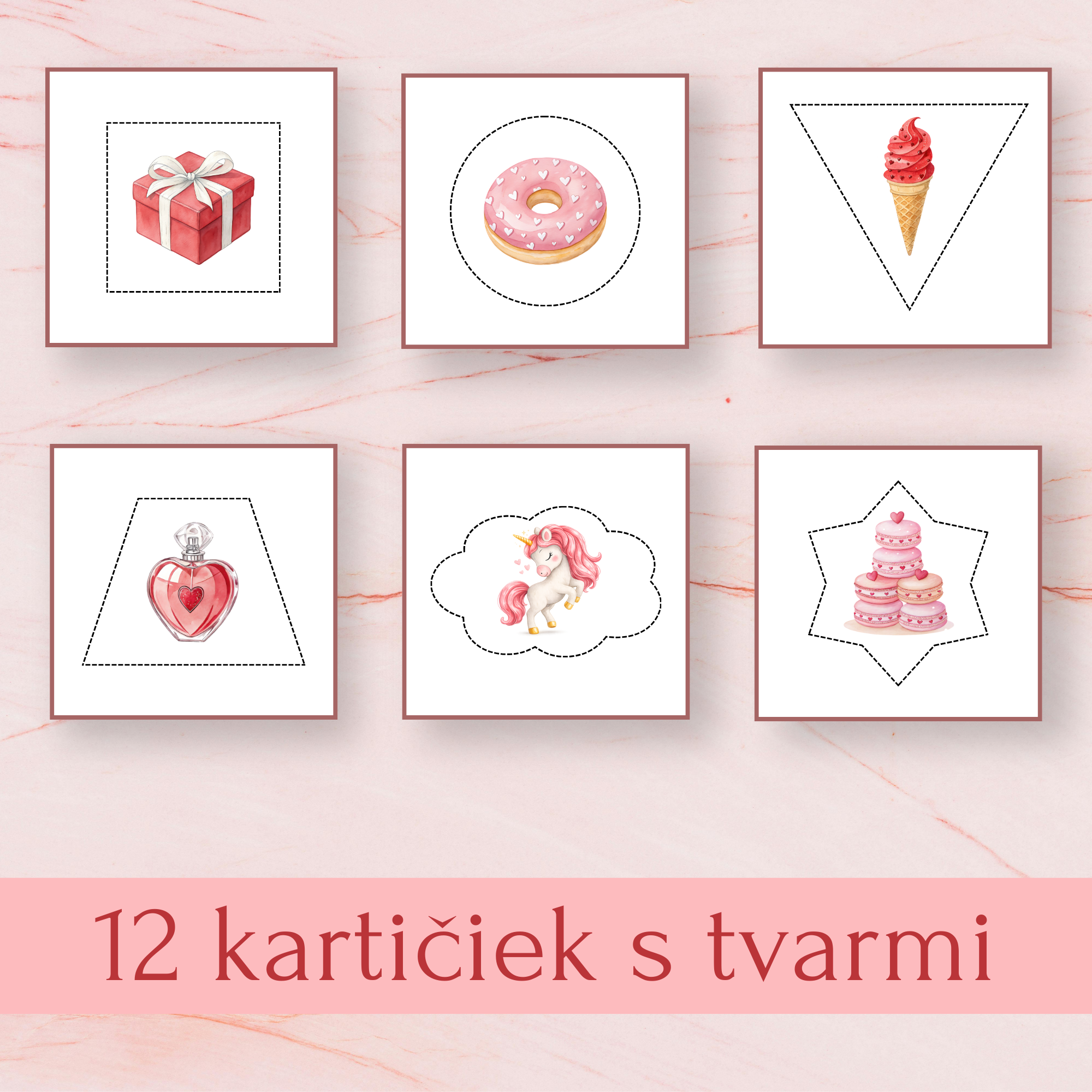 Súbor obsahuje 5 strán pásikov na postupné strihanie a 2 strany kartičiek s tvarmi (12 kartičiek). Materiál stačí vytlačiť, rozstrihať podľa naznačených čiar a ponúkať dieťaťu postupne podľa jeho pripravenosti.