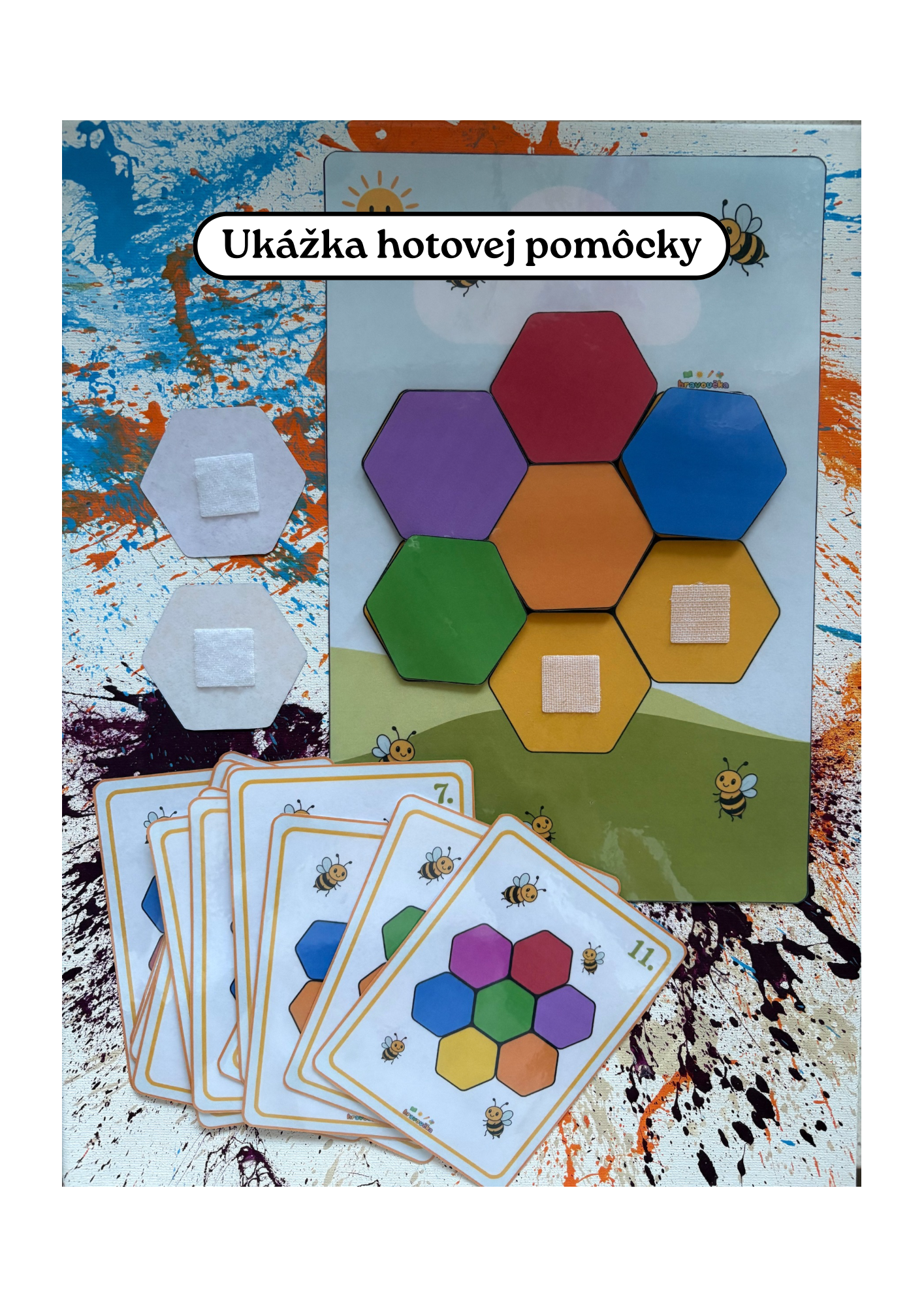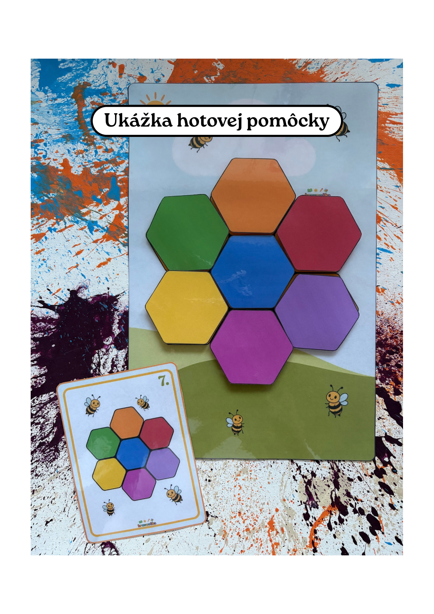 Dieťa si vyberie jednu z 12 kartičiek a podľa nej správne usporiada farebné šesťuholníky na podkladovú plochu. Na pripevňovanie tvarov odporúčam použiť suchý zips.