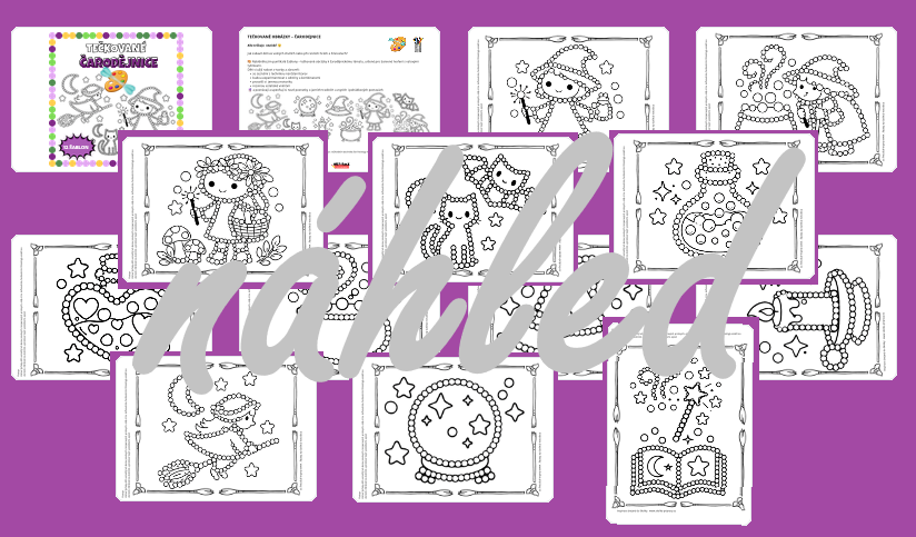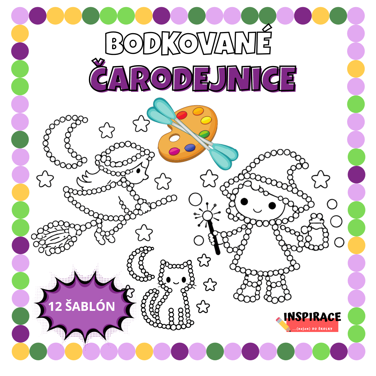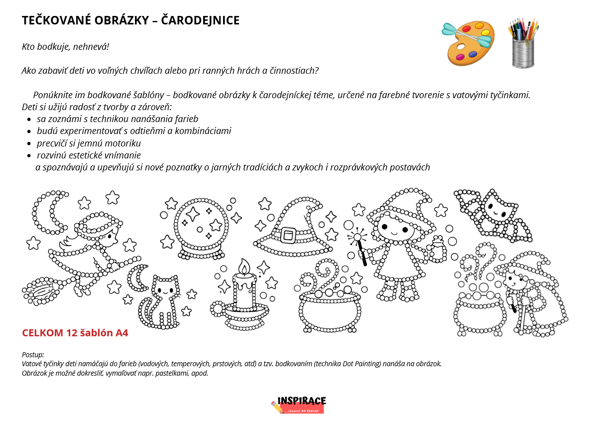 Ponúknite im bodkované šablóny – bodkované obrázky k čarodejníckej téme, určené na farebné tvorenie s vatovými tyčinkami.